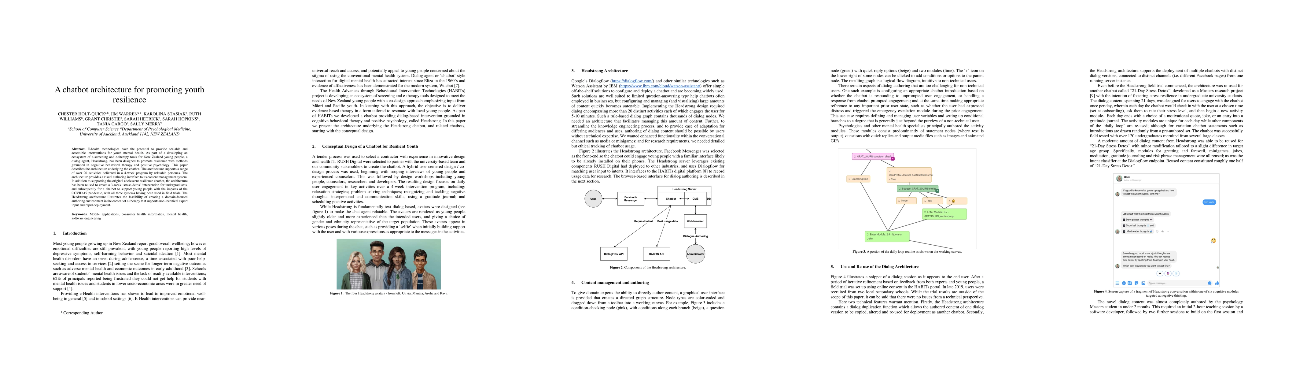 A chatbot architecture called Headstrong was developed to promote youth resilience using cognitive behavioral therapy and positive psychology methods. The architecture supports various activities and has been reused for different interventions, illustrating the feasibility of creating a domain-focused authoring environment in e-therapy.