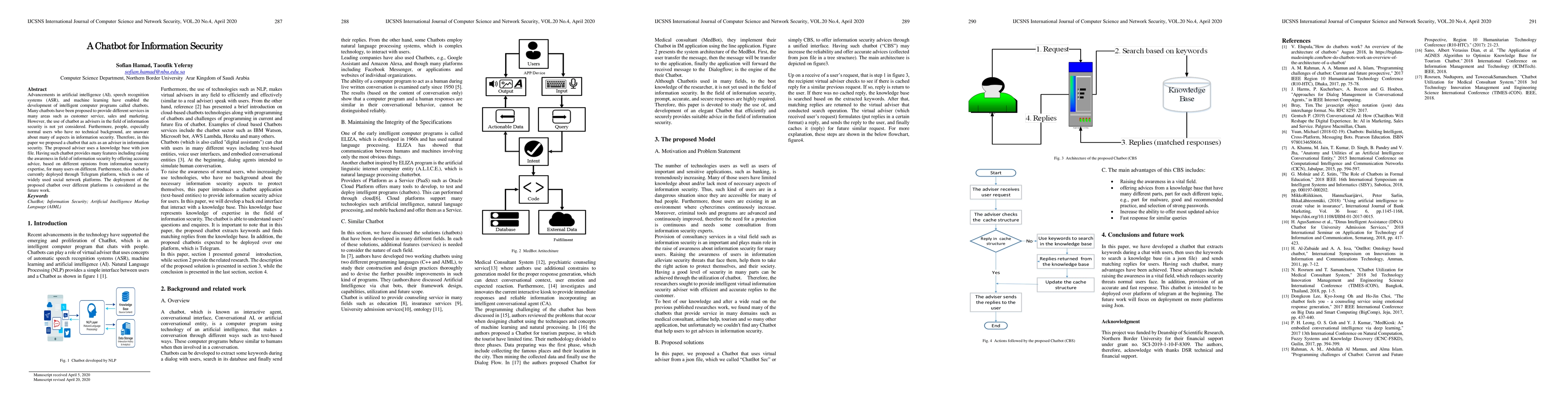 Advancements in artificial intelligence (AI), speech recognition systems (ASR), and machine learning have enabled the development of intelligent computer programs called chatbots. Many chatbots have been proposed to provide different services in many areas such as customer service, sales and marketing. However, the use of chatbot as advisers in the field of information security is not yet considered. Furthermore, people, especially normal users who have no technical background, are unaware about many of aspects in information security. Therefore, in this paper we proposed a chatbot that acts as an adviser in information security. The proposed adviser uses a knowledge base with json file. Having such chatbot provides many features including raising the awareness in field of information security by offering accurate advice, based on different opinions from information security expertise, for many users on different. Furthermore, this chatbot is currently deployed through Telegram platform, which is one of widely used social network platforms. The deployment of the proposed chatbot over different platforms is considered as the future work.
