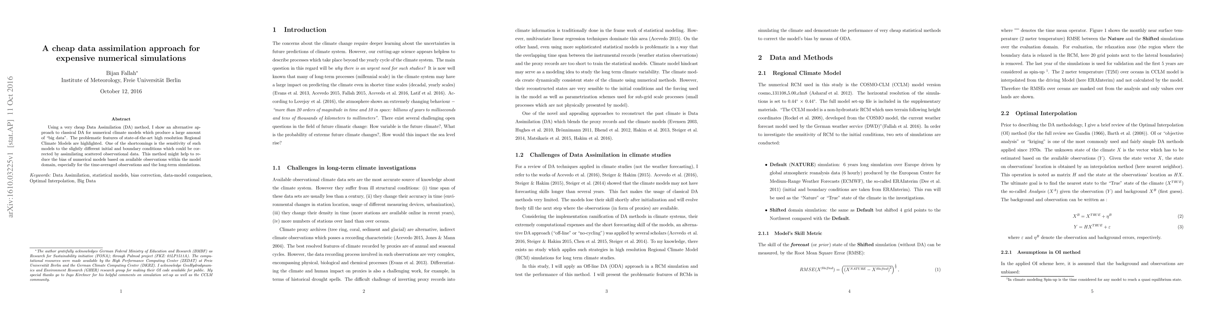 Using a very cheap Data Assimilation (DA) method, I show an alternative approach to classical DA for numerical climate models which produce a large amount of "big data". The problematic features of state-of-the-art high resolution Regional Climate Models are highlighted. One of the shortcomings is the sensitivity of such models to the slightly different initial and boundary conditions which could be corrected by assimilating scattered observational data. This method might help to reduce the bias of numerical models based on available observations within the model domain, especially for the time-averaged observations and the long-term simulations.
