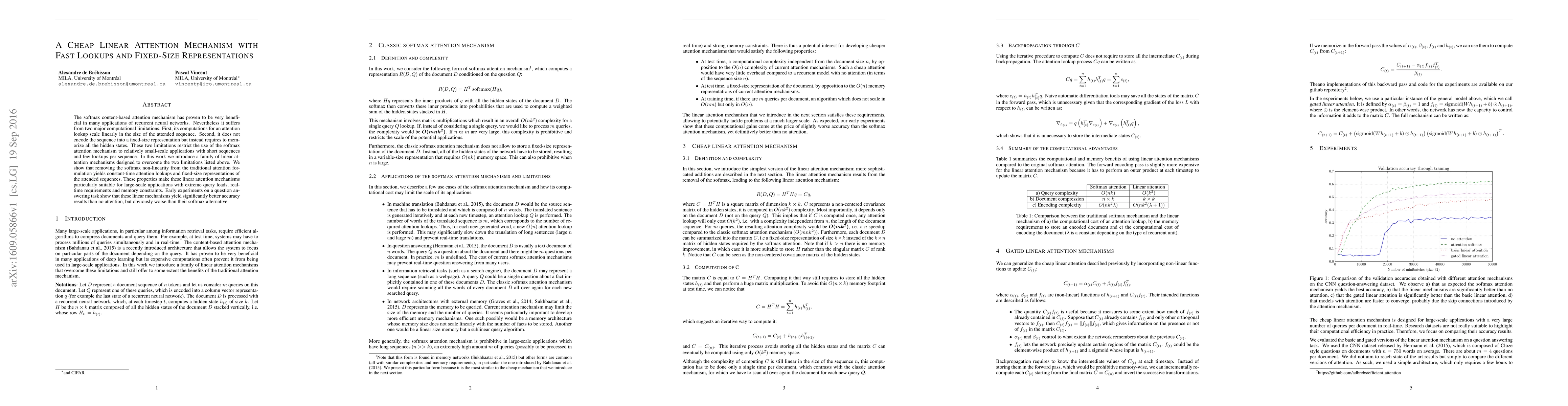 This paper introduces a new linear attention mechanism that provides constant-time lookups and fixed-size representations, addressing the computational limitations of traditional softmax attention. Early results indicate improved accuracy over no attention but lower performance compared to softmax attention.