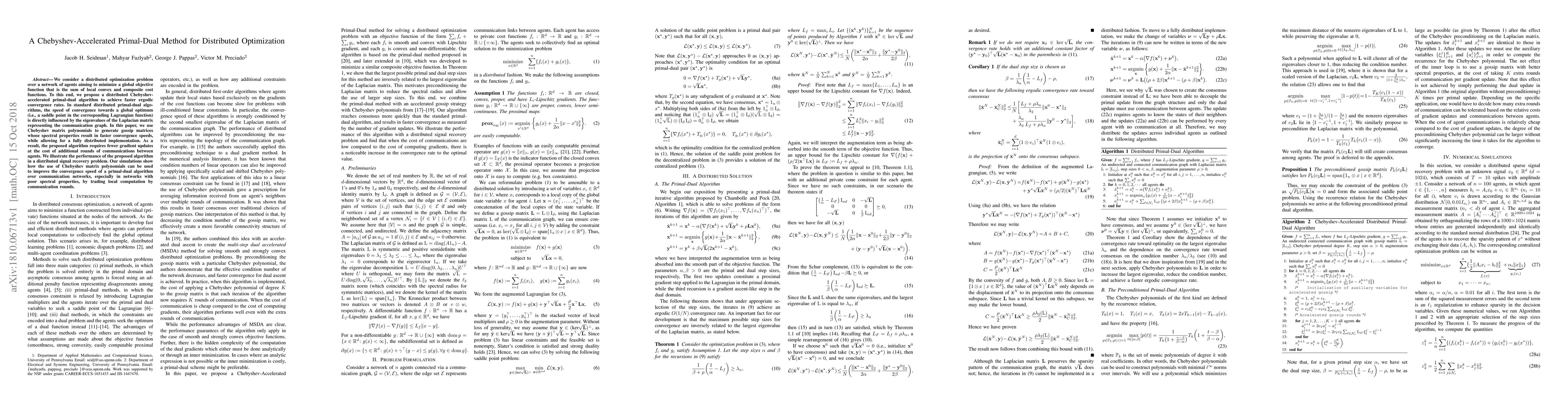 This paper proposes a Chebyshev-accelerated primal-dual algorithm for distributed optimization over a network of agents, achieving faster convergence by using Chebyshev matrix polynomials to enhance gossip matrices. The method trades off additional communication rounds for fewer gradient updates, demonstrating improved performance in distributed signal recovery.