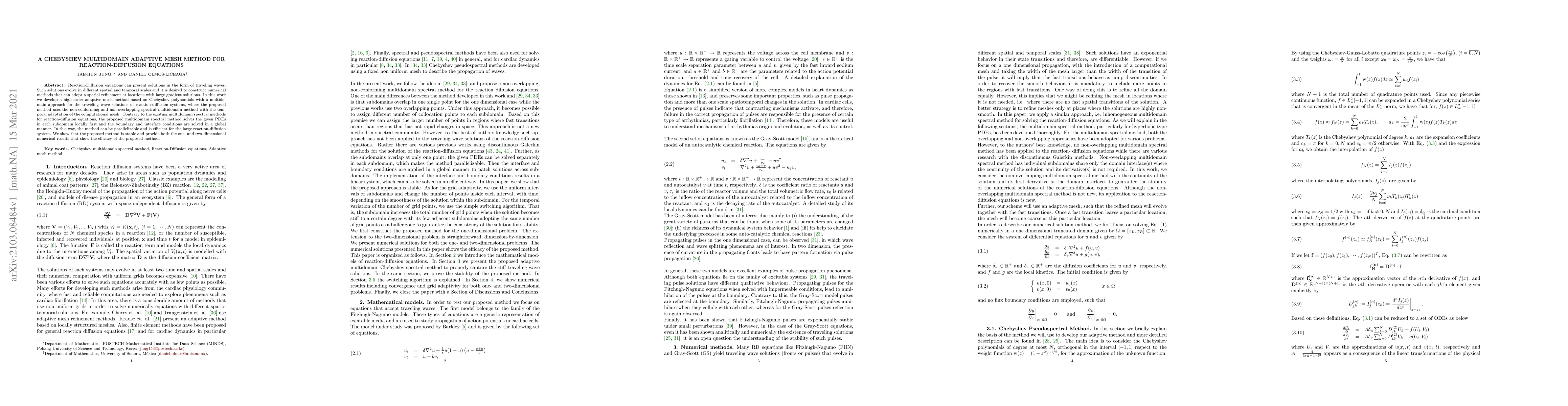 A new method for solving Reaction-Diffusion equations using a Chebyshev multidomain adaptive mesh is presented, offering improved efficiency and parallelizability for large systems.