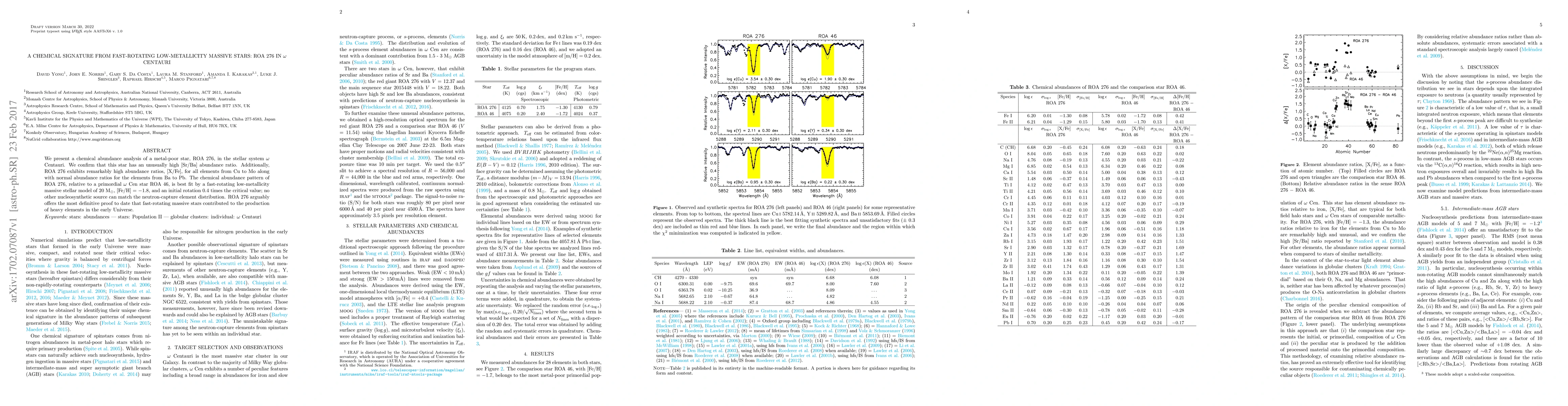 This paper analyzes the chemical abundances of ROA 276 in omega Centauri, revealing high [Sr/Ba] and [X/Fe] ratios for certain elements, which align with a fast-rotating, low-metallicity massive star model. This supports the theory that such stars significantly contributed to heavy element production in the early Universe.