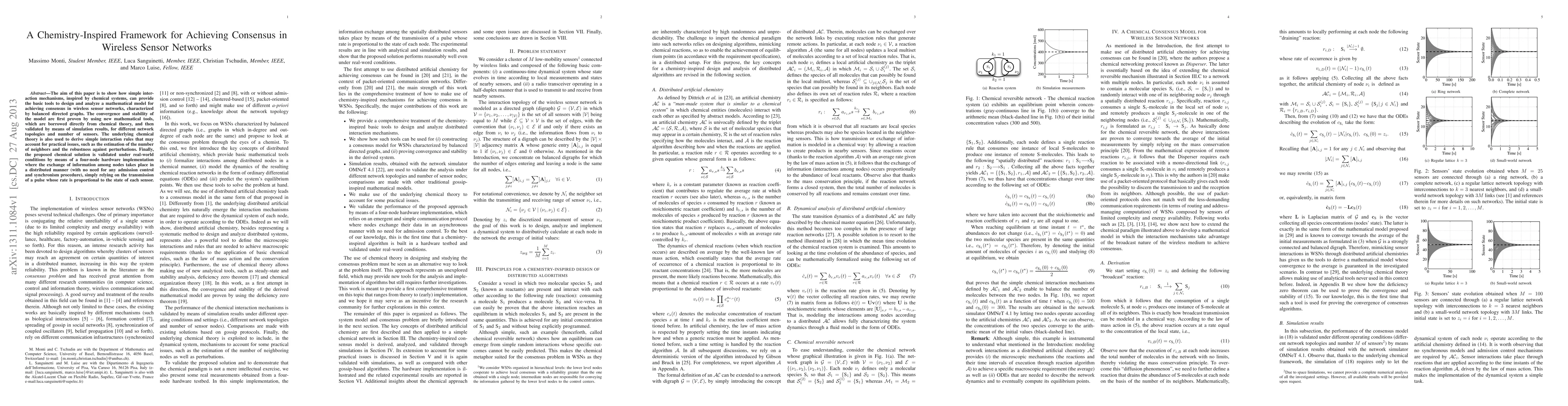 The aim of this paper is to show how simple interaction mechanisms, inspired by chemical systems, can provide the basic tools to design and analyze a mathematical model for achieving consensus in wireless sensor networks, characterized by balanced directed graphs. The convergence and stability of the model are first proven by using new mathematical tools, which are borrowed directly from chemical theory, and then validated by means of simulation results, for different network topologies and number of sensors. The underlying chemical theory is also used to derive simple interaction rules that may account for practical issues, such as the estimation of the number of neighbors and the robustness against perturbations. Finally, the proposed chemical solution is validated under real-world conditions by means of a four-node hardware implementation where the exchange of information among nodes takes place in a distributed manner (with no need for any admission control and synchronism procedure), simply relying on the transmission of a pulse whose rate is proportional to the state of each sensor.