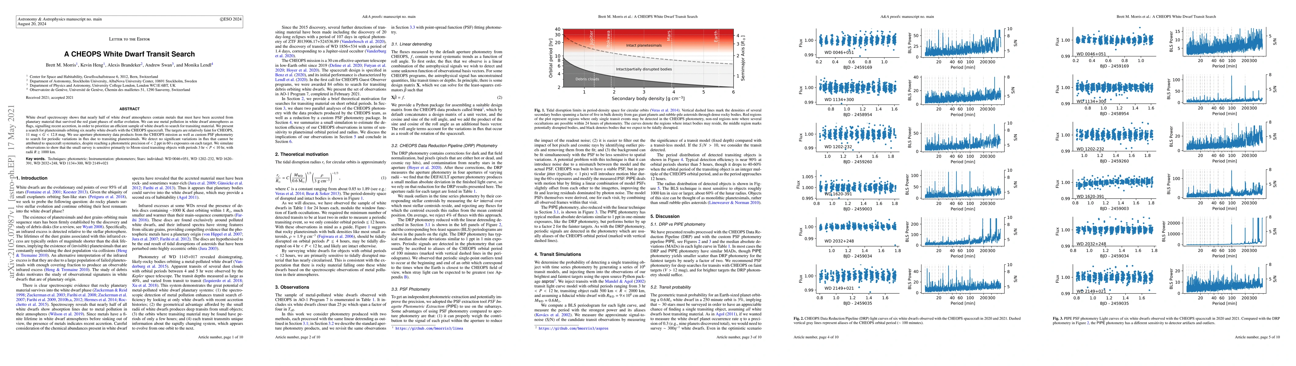 This paper reports a CHEOPS spacecraft search for transiting planetesimals around six nearby white dwarfs, finding no significant flux variations. The study suggests the survey is sensitive to Moon-sized objects with radii of at least 1000 km and periods between 3 to 10 hours.