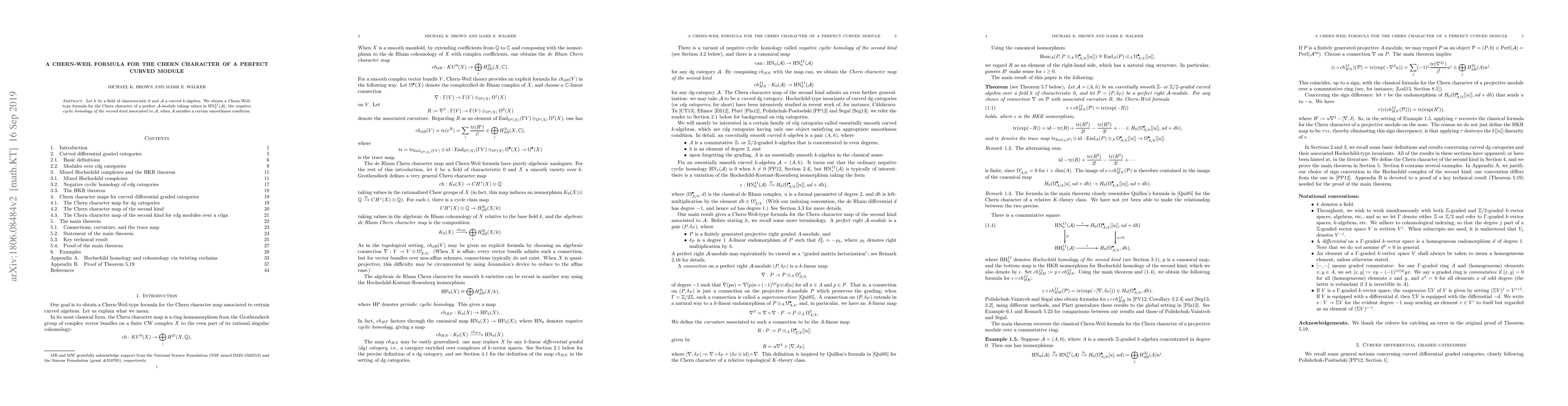 This paper presents a Chern-Weil formula for the Chern character of perfect modules over a curved $k$-algebra under specific smoothness conditions, expressing the result in terms of the negative cyclic homology of the second kind associated with $\mathcal{A}$.