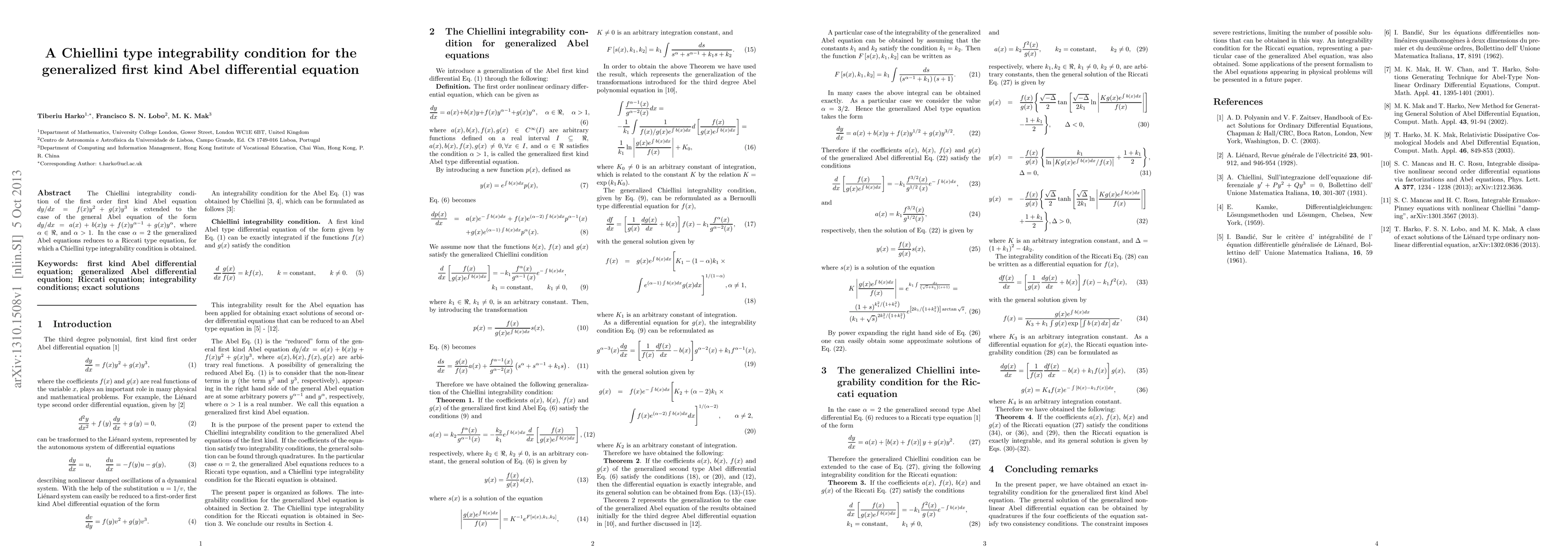 This paper extends the Chiellini integrability condition to generalized first kind Abel differential equations of the form $dy/dx=a(x)+b(x)y+f(x)y^{\alpha -1}+g(x)y^{\alpha}$, where $\alpha > 1$. It also derives a Chiellini type condition for the special case when $\alpha = 2$, reducing the equation to a Riccati type.