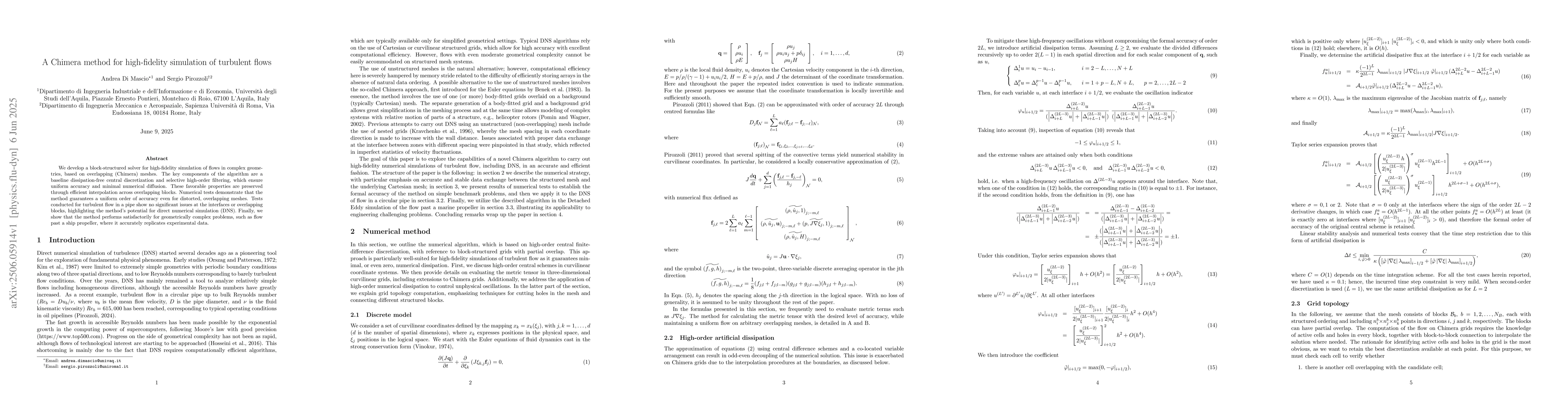 This research introduces a Chimera method for high-fidelity simulation of turbulent flows in complex geometries using overlapping meshes. The method maintains accuracy and minimal numerical diffusion, demonstrating successful application in both pipe flow and ship propeller simulations, closely matching experimental data.