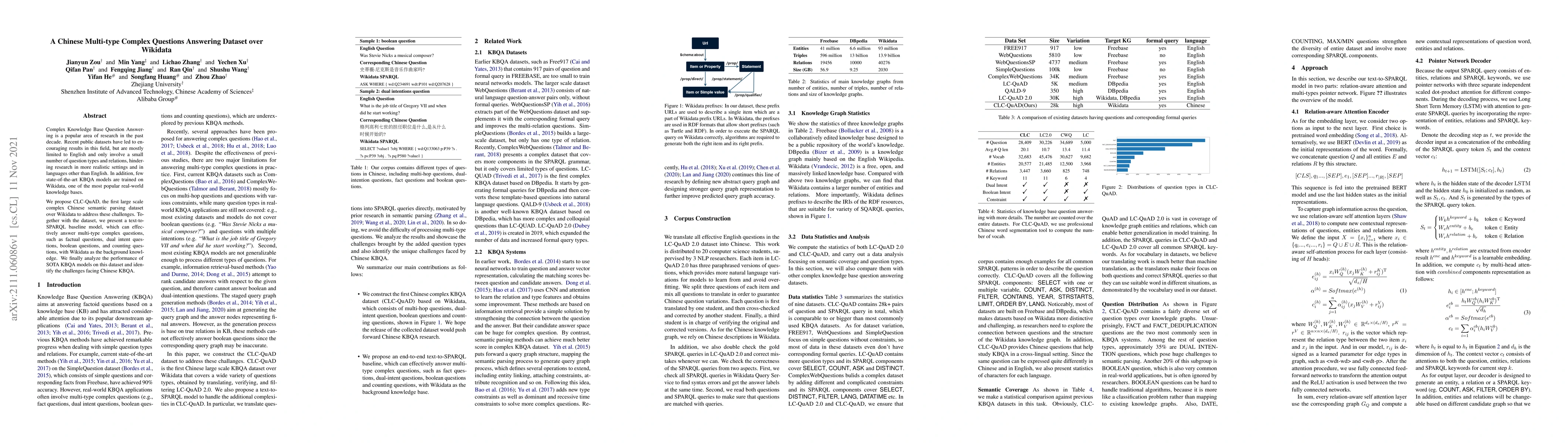 This paper introduces CLC-QuAD, the first large-scale complex Chinese question answering dataset over Wikidata, aiming to address limitations in existing English datasets and expand research to non-English languages. The authors also present a text-to-SPARQL baseline model for answering various complex question types and analyze the performance of state-of-the-art models on this new dataset.
