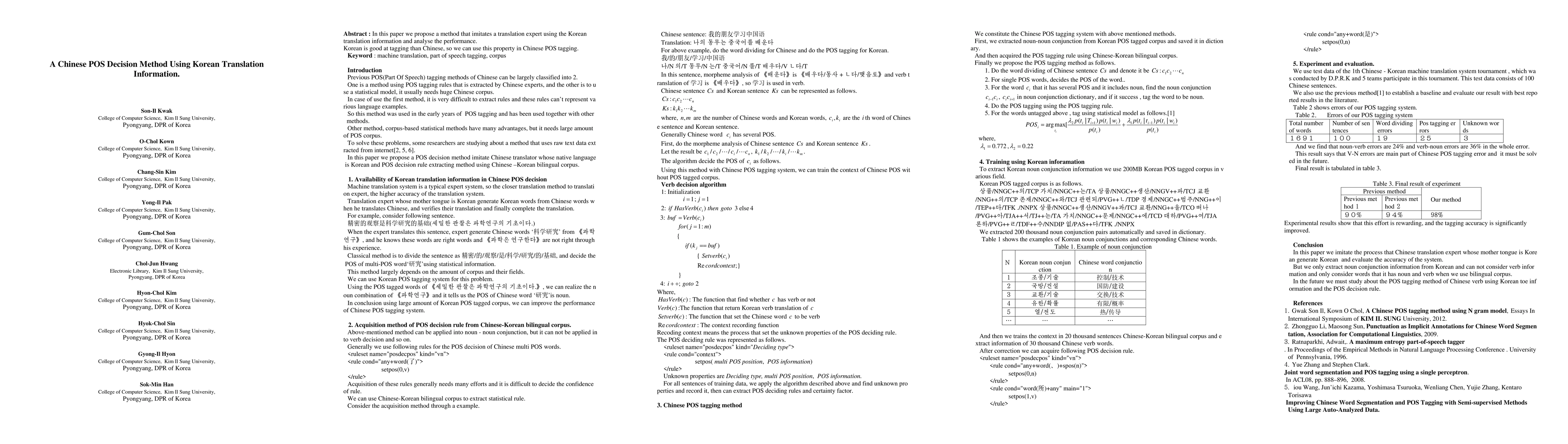 Summary: This paper proposes a method to enhance Chinese part-of-speech (POS) tagging by leveraging Korean translation information, capitalizing on Korea's superior tagging accuracy compared to China. The performance of the proposed method is analyzed.