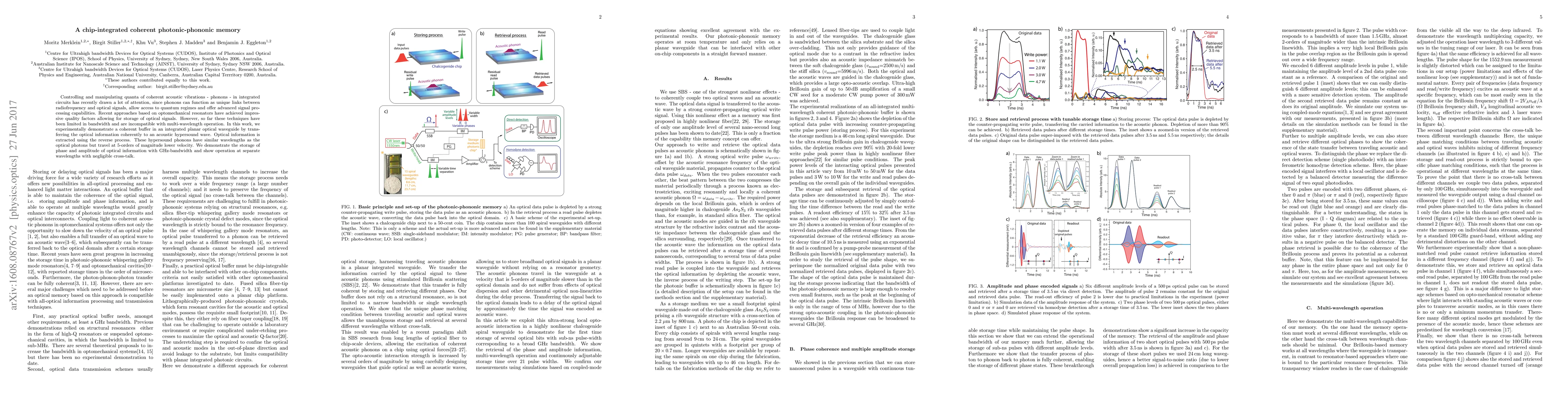 This paper presents an integrated photonic-phononic memory chip that transfers optical information to coherent acoustic phonons for high-bandwidth storage and retrieval, achieving GHz-bandwidth and multi-wavelength operation without cross-talk.