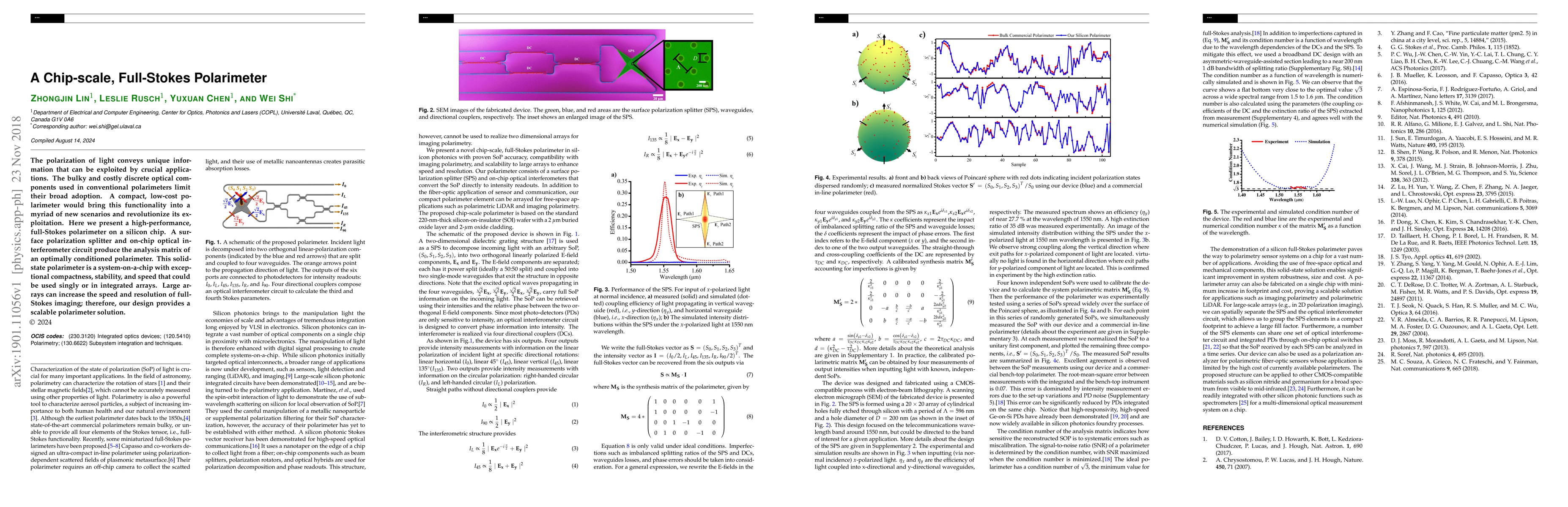 A chip-scale, full-Stokes polarimeter on silicon offers compact, low-cost polarization analysis, leveraging a surface polarization splitter and on-chip interferometer for high-performance measurements, suitable for scalable arrays to enhance imaging speed and resolution.