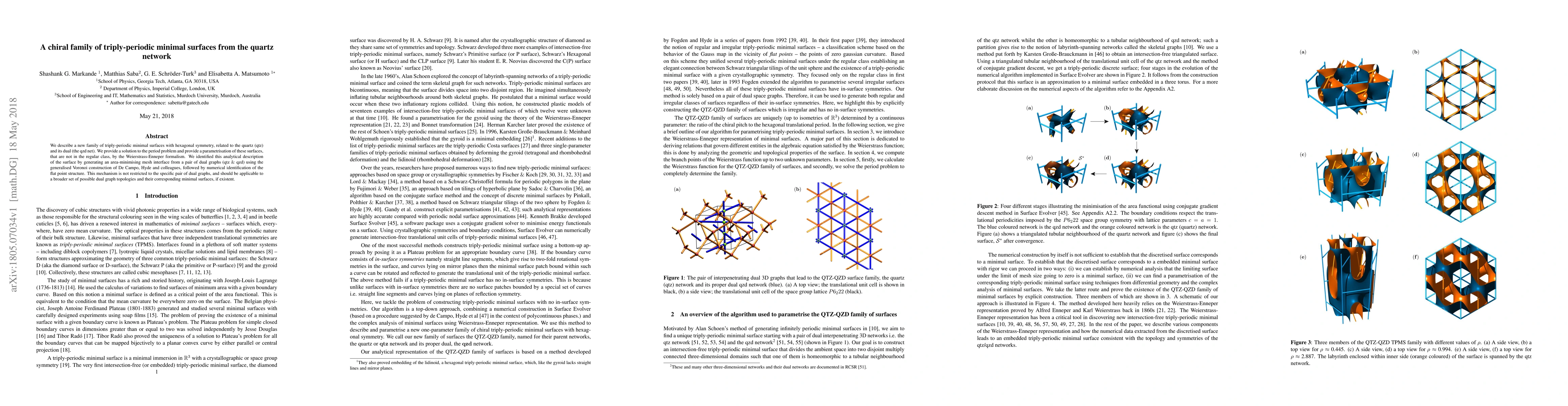 We describe a new family of triply-periodic minimal surfaces with hexagonal symmetry, related to the quartz (qtz) and its dual (the qzd net). We provide a solution to the period problem and provide a parametrisation of these surfaces, that are not in the regular class, by the Weierstrass-Enneper formalism. We identified this analytical description of the surface by generating an area-minimising mesh interface from a pair of dual graphs (qtz & qzd) using the generalised Voronoi construction of De Campo, Hyde and colleagues, followed by numerical identification of the flat point structure. This mechanism is not restricted to the specific pair of dual graphs, and should be applicable to a broader set of possible dual graph topologies and their corresponding minimal surfaces, if existent.