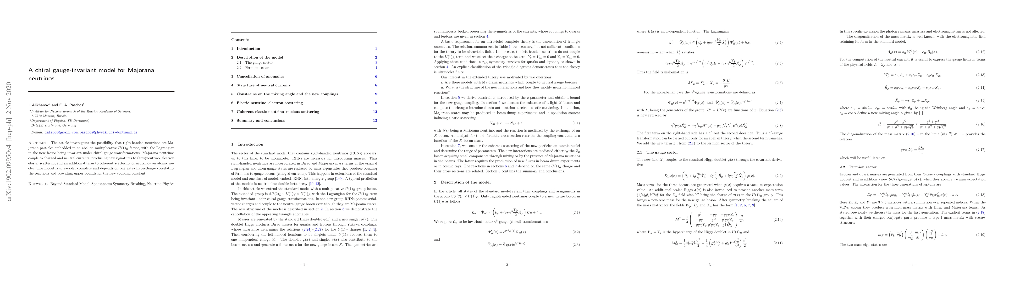 The article investigates the possibility that right-handed neutrinos are Majorana particles embedded in an abelian multiplicative $U(1)_R$ factor, with the Lagrangian in the new factor being invariant under chiral gauge transformations. Majorana neutrinos couple to charged and neutral currents, producing new signatures to (anti)neutrino-electron elastic scattering and an additional term to coherent scattering of neutrinos on atomic nuclei. The model is ultraviolet complete and depends on one extra hypercharge correlating the reactions and providing upper bounds for the new coupling constant.