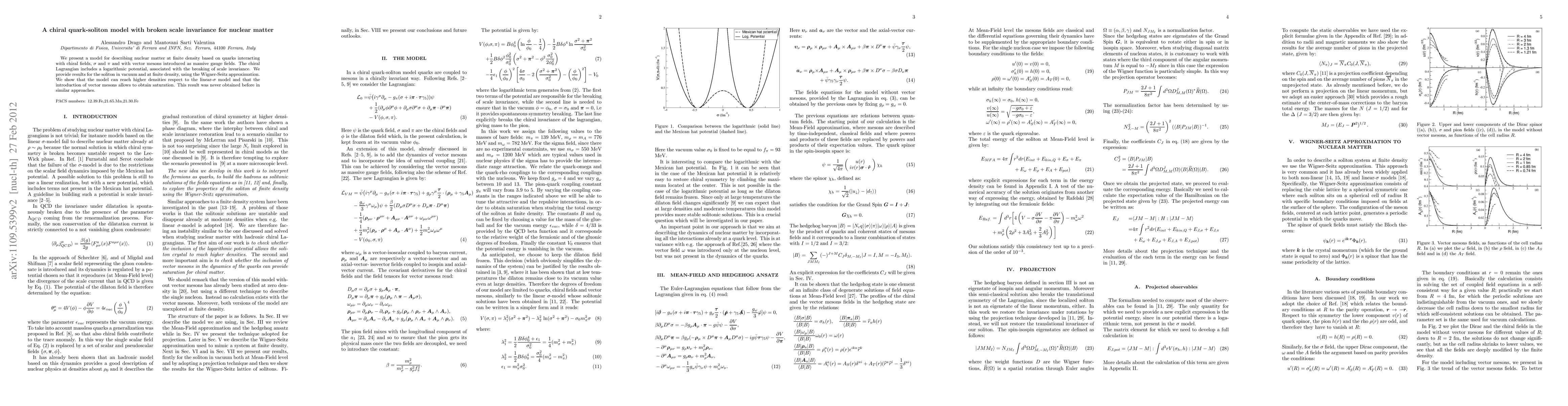 We present a model for describing nuclear matter at finite density based on quarks interacting with chiral fields, \sigma and \pi and with vector mesons introduced as massive gauge fields. The chiral Lagrangian includes a logarithmic potential, associated with the breaking of scale invariance. We provide results for the soliton in vacuum and at finite density, using the Wigner-Seitz approximation. We show that the model can reach higher densities respect to the linear-\sigma model and that the introduction of vector mesons allows to obtain saturation. This result was never obtained before in similar approaches.