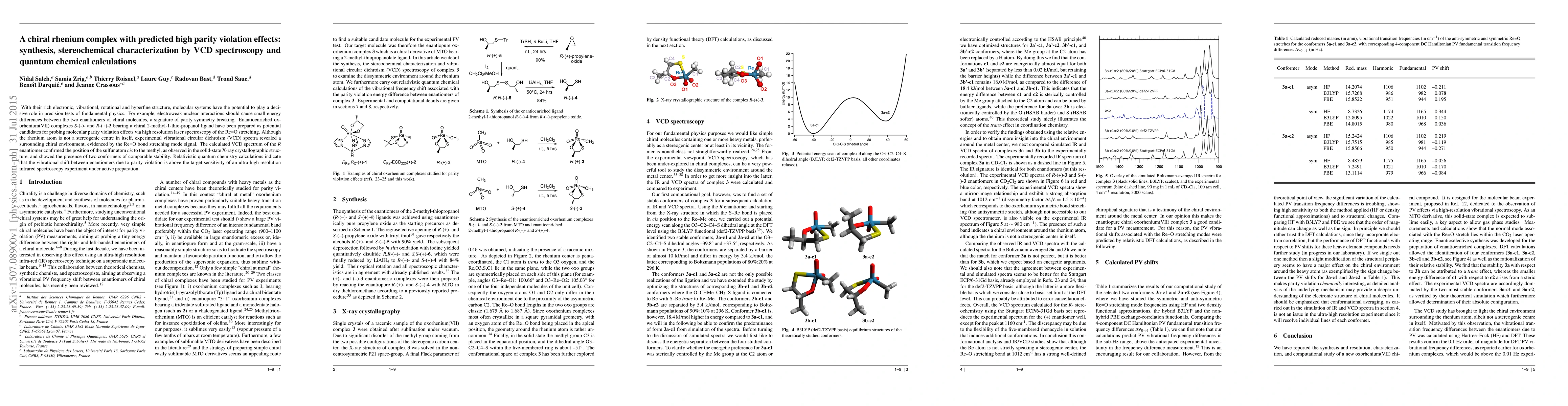 This paper reports the synthesis and stereochemical characterization of enantioenriched chiral oxorhenium(VII) complexes, aiming to probe molecular parity violation effects. Experimental and theoretical VCD spectroscopy confirmed the chiral environment and revealed two conformers, suggesting potential for high-sensitivity tests of fundamental physics.