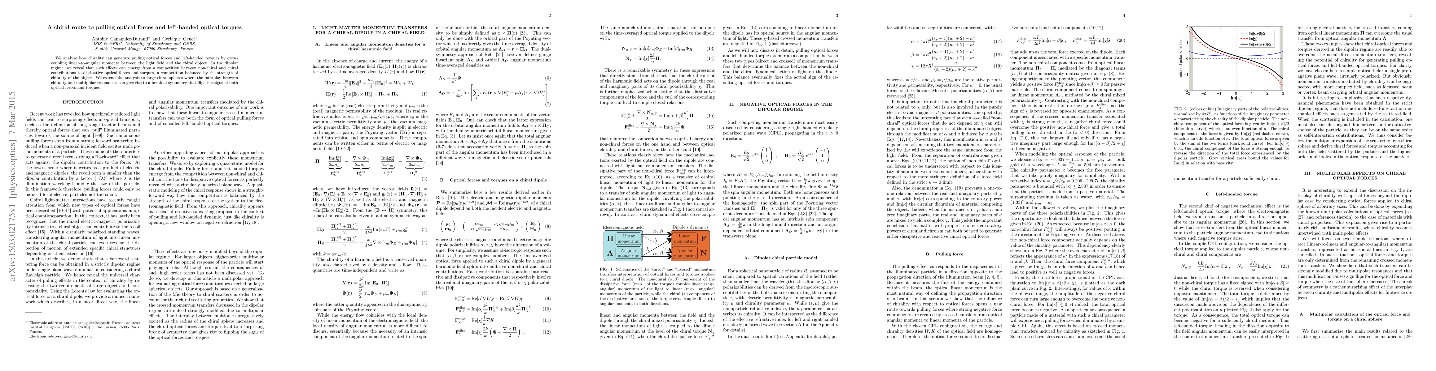 This paper investigates how chiral objects can generate pulling optical forces and left-handed optical torques through the interplay of linear and angular momenta between light and the chiral object. The study reveals that these effects arise from a balance between non-chiral and chiral contributions to optical forces and torques, especially in the dipolar regime and large chiral spheres where multipolar resonances break symmetry.