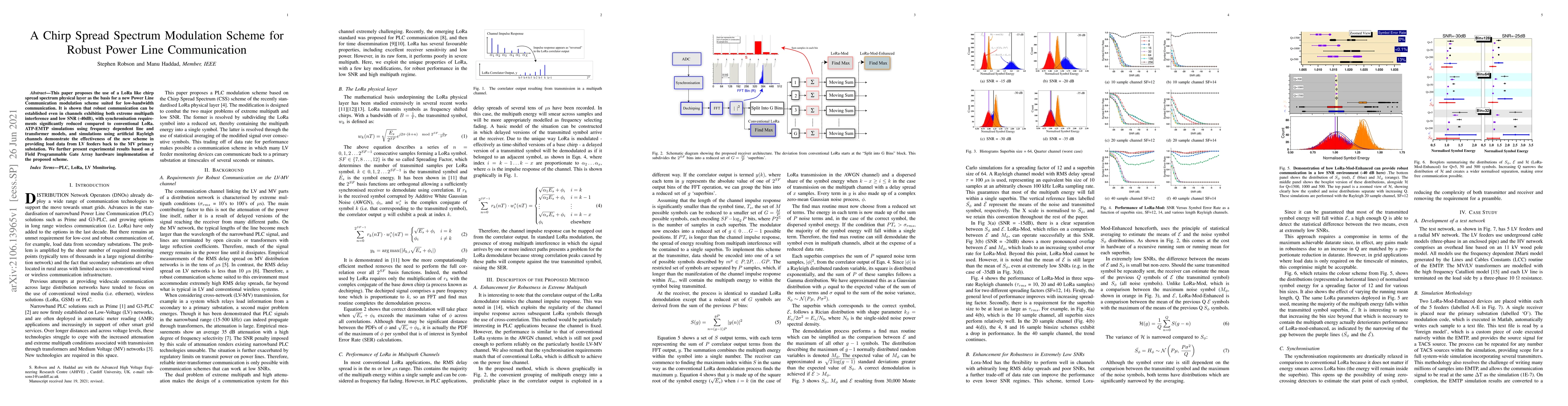 This paper introduces a chirp spread spectrum modulation scheme for robust low-bandwidth power line communication, demonstrating effective performance in challenging multipath and low SNR conditions, and presenting both simulation and hardware implementation results. Experimental results confirm the scheme's capability to transmit load data from low voltage feeders to the primary substation.