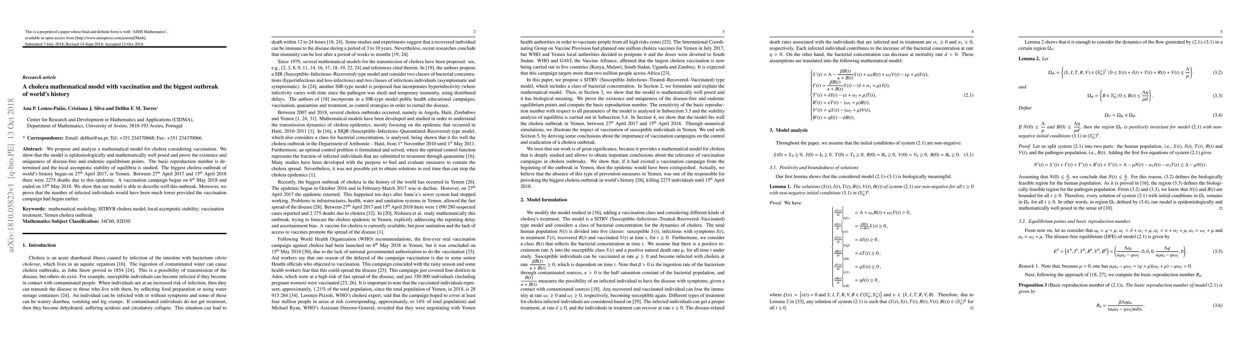 This paper develops a mathematical model for cholera that incorporates vaccination and analyzes its epidemiological and mathematical properties. The model accurately describes the largest cholera outbreak in history in Yemen from 2017 to 2018, showing that an earlier vaccination campaign could have significantly reduced infections.
