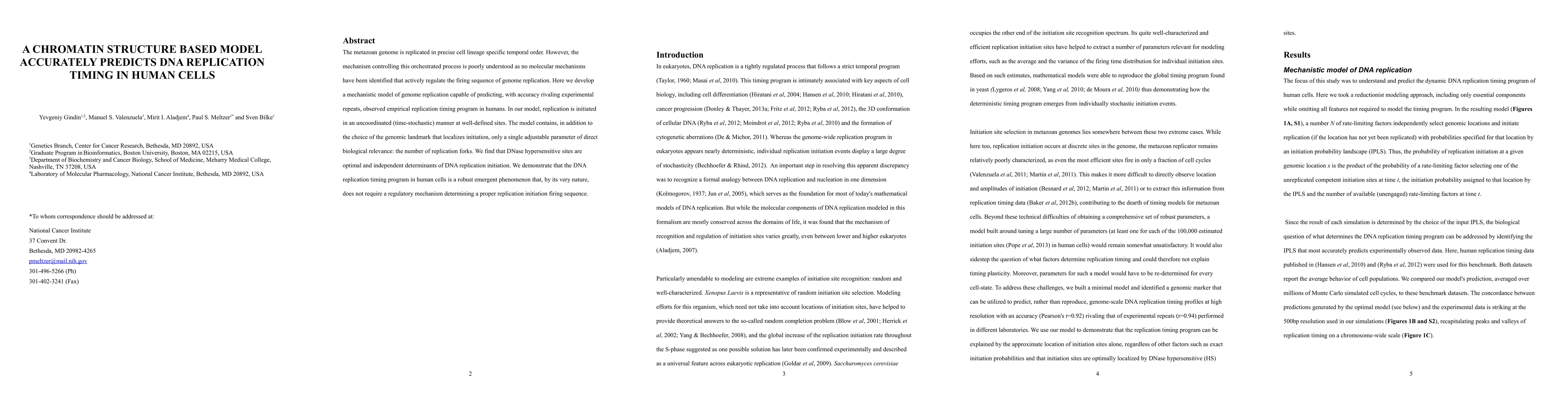 This paper develops a chromatin structure-based model that accurately predicts DNA replication timing in human cells, revealing that replication initiation occurs at DNase hypersensitive sites and is robust without a specific regulatory mechanism. The model's accuracy rivals experimental data, highlighting the role of replication forks as a key adjustable parameter.