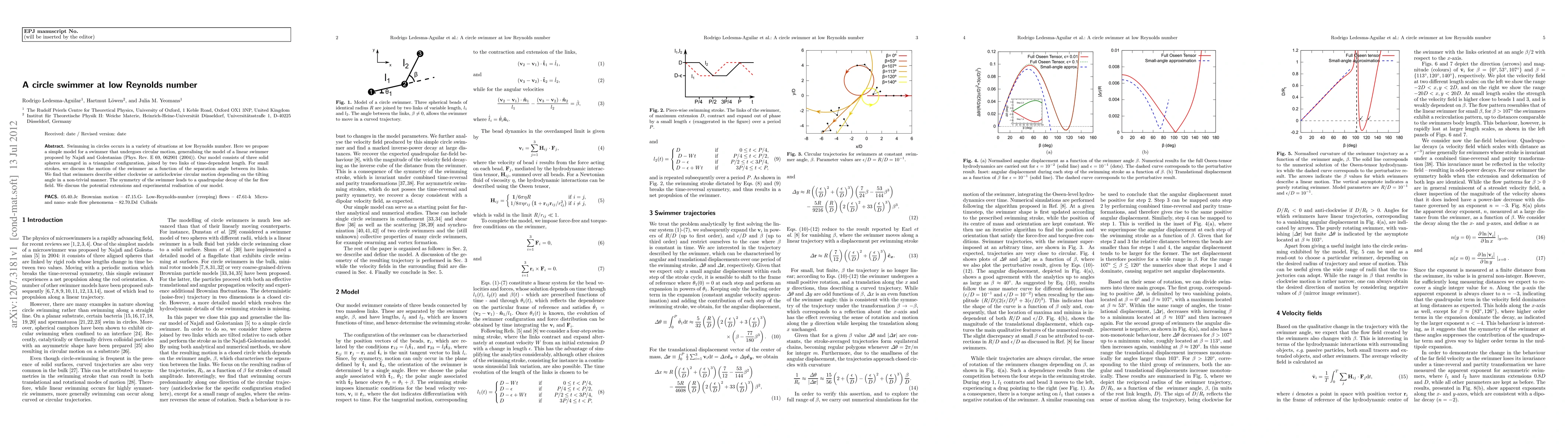 This paper proposes a simple model for a circular swimmer at low Reynolds number, consisting of three spheres in a triangular configuration connected by two length-varying links. The model predicts that the swimmer's motion depends on the separation angle and tilting angle, resulting in either clockwise or anticlockwise circular motion, and exhibits a quadrupolar decay in the far flow field.