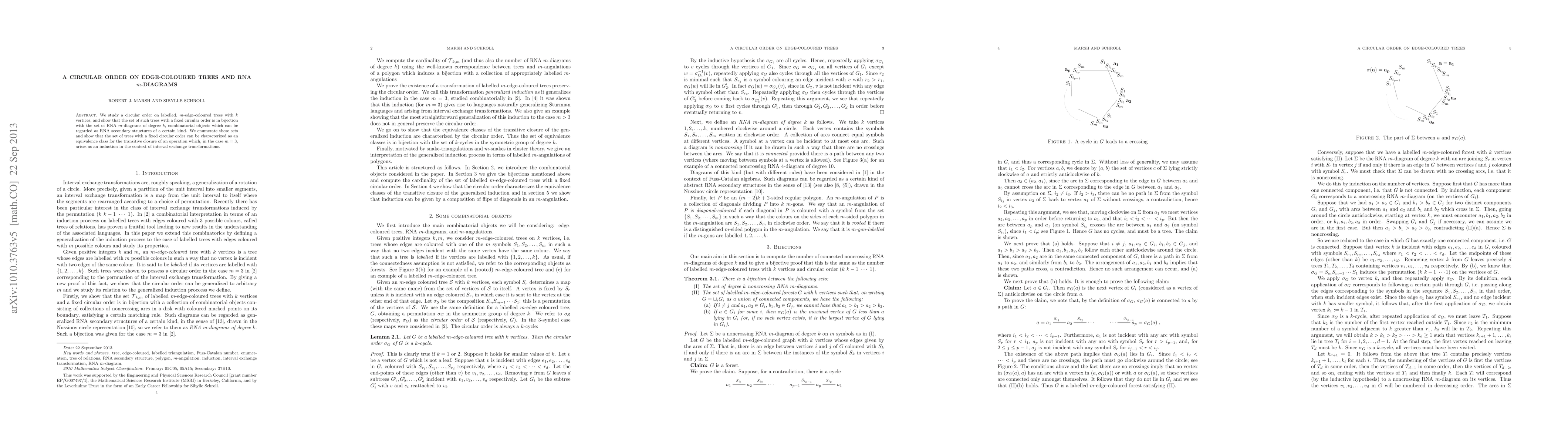 We study a circular order on labelled, m-edge-coloured trees with k vertices, and show that the set of such trees with a fixed circular order is in bijection with the set of RNA m-diagrams of degree k, combinatorial objects which can be regarded as RNA secondary structures of a certain kind. We enumerate these sets and show that the set of trees with a fixed circular order can be characterized as an equivalence class for the transitive closure of an operation which, in the case m=3, arises as an induction in the context of interval exchange transformations.