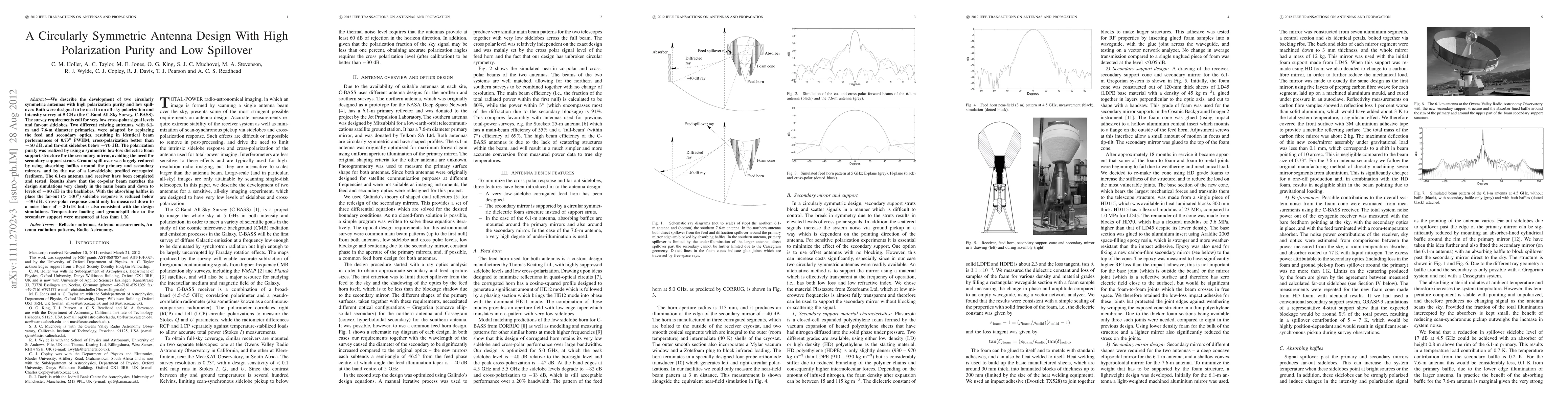 We describe the development of two circularly symmetric antennas with high polarization purity and low spillover. Both were designed to be used in an all-sky polarization and intensity survey at 5 GHz (the C-Band All-Sky Survey, C-BASS). The survey requirements call for very low levels of cross-polar leakage and far-out sidelobes. Two different existing antennas, with 6.1-m and 7.6-m diameter primaries, were adapted by replacing the feed and secondary optics, resulting in identical beam performances of 0.73deg FWHM, cross-polarization better than -50 dB, and far-out sidelobes below -70 dB. The polarization purity was realized by using a symmetric low-loss dielectric foam support structure for the secondary mirror, avoiding the need for secondary support struts. Ground spill-over was largely reduced by using absorbing baffles around the primary and secondary mirrors, and by the use of a low-sidelobe profiled corrugated feedhorn. The 6.1-m antenna and receiver have been completed and test results show that the optics meet their design goals.