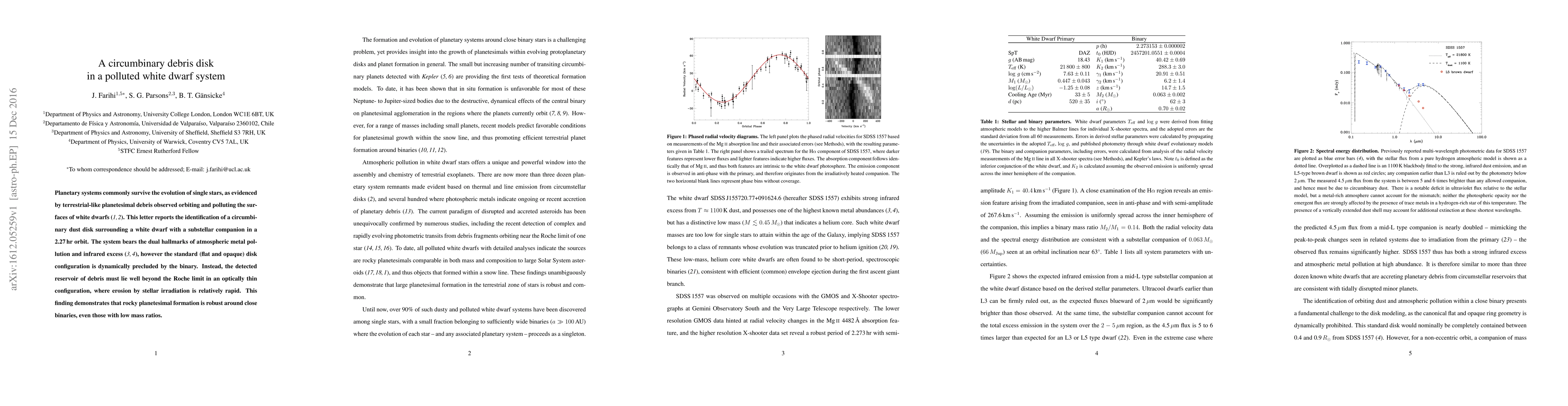 This paper identifies a circumbinary debris disk around a polluted white dwarf with a substellar companion, challenging the standard disk model due to the binary system's dynamics. The findings suggest that debris formation and retention are viable even in close binary systems, indicating robust rocky planetesimal formation.