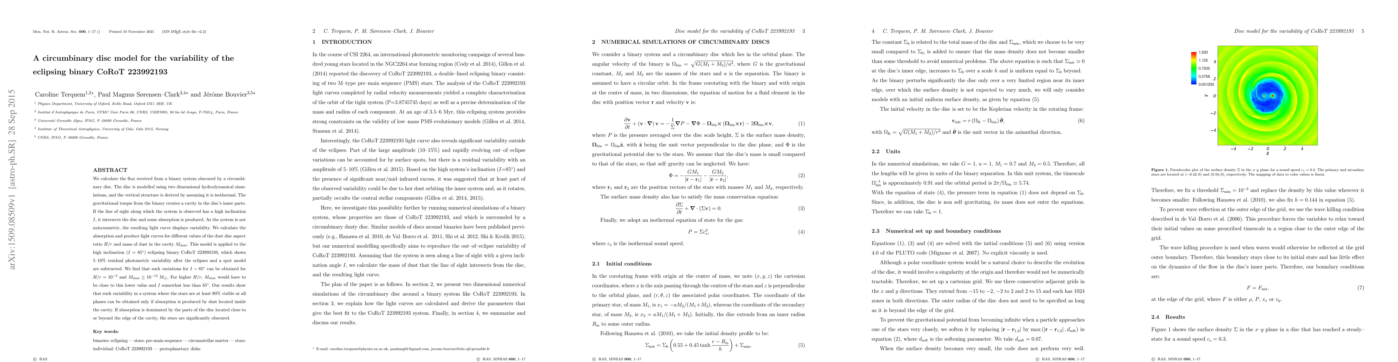 We calculate the flux received from a binary system obscured by a circumbinary disc. The disc is modelled using two dimensional hydrodynamical simulations, and the vertical structure is derived by assuming it is isothermal. The gravitational torque from the binary creates a cavity in the disc's inner parts. If the line of sight along which the system is observed has a high inclination $I$, it intersects the disc and some absorption is produced. As the system is not axisymmetric, the resulting light curve displays variability. We calculate the absorption and produce light curves for different values of the dust disc aspect ratio $H/r$ and mass of dust in the cavity $M_{\rm dust}$. This model is applied to the high inclination ($I=85^{\circ}$) eclipsing binary CoRoT 223992193, which shows 5-10% residual photometric variability after the eclipses and a spot model are subtracted. We find that such variations for $I \sim 85^{\circ}$ can be obtained for $H/r=10^{-3}$ and $M_{\rm dust} \ge 10^{-12}$ M$_{\odot}$. For higher $H/r$, $M_{\rm dust}$ would have to be close to this lower value and $I$ somewhat less than $85^{\circ}$. Our results show that such variability in a system where the stars are at least 90% visible at all phases can be obtained only if absorption is produced by dust located inside the cavity. If absorption is dominated by the parts of the disc located close to or beyond the edge of the cavity, the stars are significantly obscured.