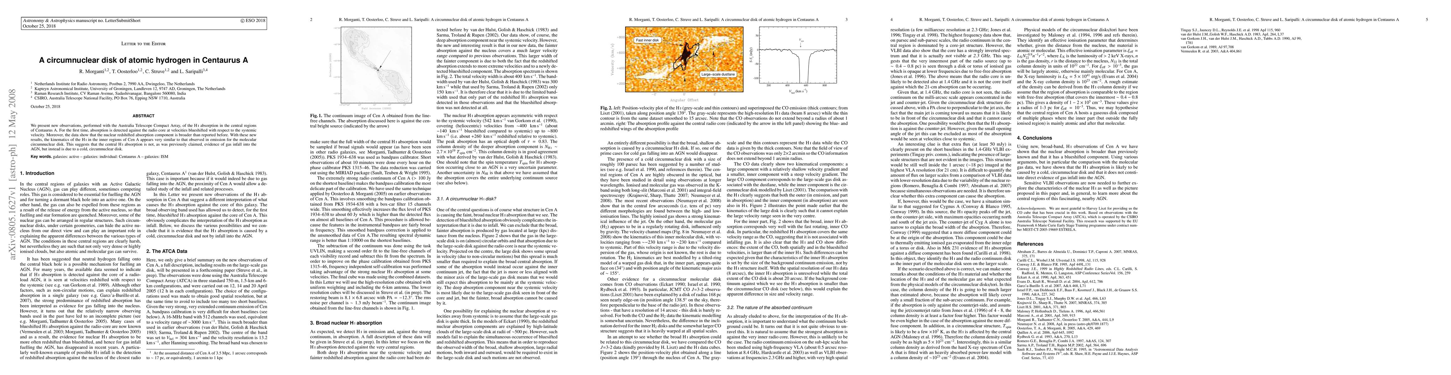New observations reveal HI absorption in Centaurus A's central regions, showing blueshifted absorption against the radio core and broader nuclear redshifted absorption. This suggests the presence of a cold, circumnuclear HI disk rather than gas infall into the AGN.