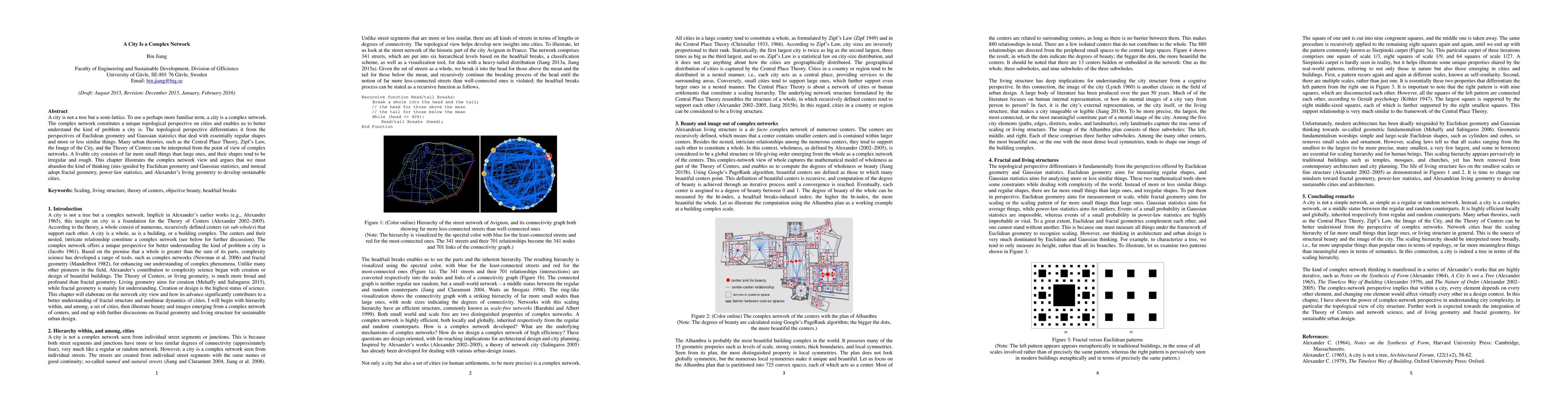 A city is not a tree but a semi-lattice. To use a perhaps more familiar term, a city is a complex network. The complex network constitutes a unique topological perspective on cities and enables us to better understand the kind of problem a city is. The topological perspective differentiates it from the perspectives of Euclidean geometry and Gaussian statistics that deal with essentially regular shapes and more or less similar things. Many urban theories, such as the Central Place Theory, Zipf's Law, the Image of the City, and the Theory of Centers can be interpreted from the point of view of complex networks. A livable city consists of far more small things than large ones, and their shapes tend to be irregular and rough. This chapter illustrates the complex network view and argues that we must abandon the kind of thinking (mis-)guided by Euclidean geometry and Gaussian statistics, and instead adopt fractal geometry, power-law statistics, and Alexander's living geometry to develop sustainable cities. Keywords: Scaling, living structure, theory of centers, objective beauty, head/tail breaks