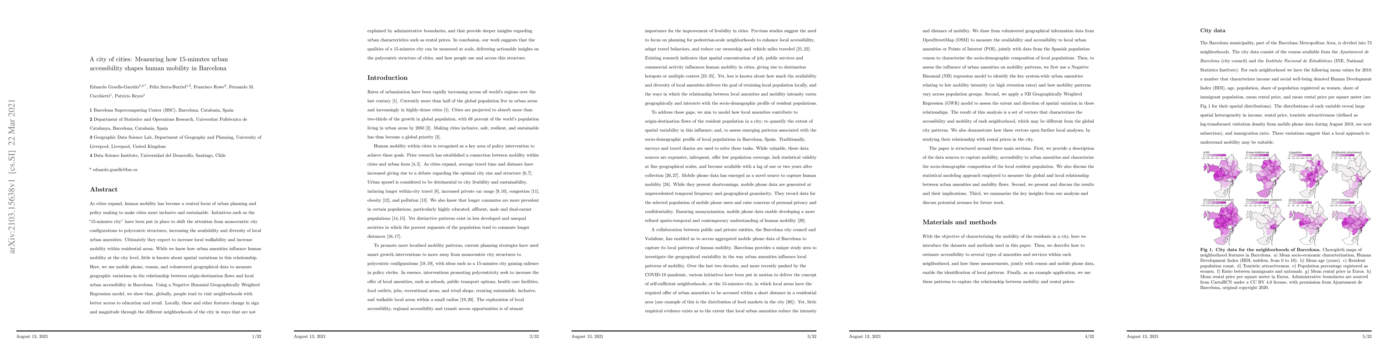 As cities expand, human mobility has become a central focus of urban planning and policy making to make cities more inclusive and sustainable. Initiatives such as the "15-minutes city" have been put in place to shift the attention from monocentric city configurations to polycentric structures, increasing the availability and diversity of local urban amenities. Ultimately they expect to increase local walkability and increase mobility within residential areas. While we know how urban amenities influence human mobility at the city level, little is known about spatial variations in this relationship. Here, we use mobile phone, census, and volunteered geographical data to measure geographic variations in the relationship between origin-destination flows and local urban accessibility in Barcelona. Using a Negative Binomial Geographically Weighted Regression model, we show that, globally, people tend to visit neighborhoods with better access to education and retail. Locally, these and other features change in sign and magnitude through the different neighborhoods of the city in ways that are not explained by administrative boundaries, and that provide deeper insights regarding urban characteristics such as rental prices. In conclusion, our work suggests that the qualities of a 15-minutes city can be measured at scale, delivering actionable insights on the polycentric structure of cities, and how people use and access this structure.