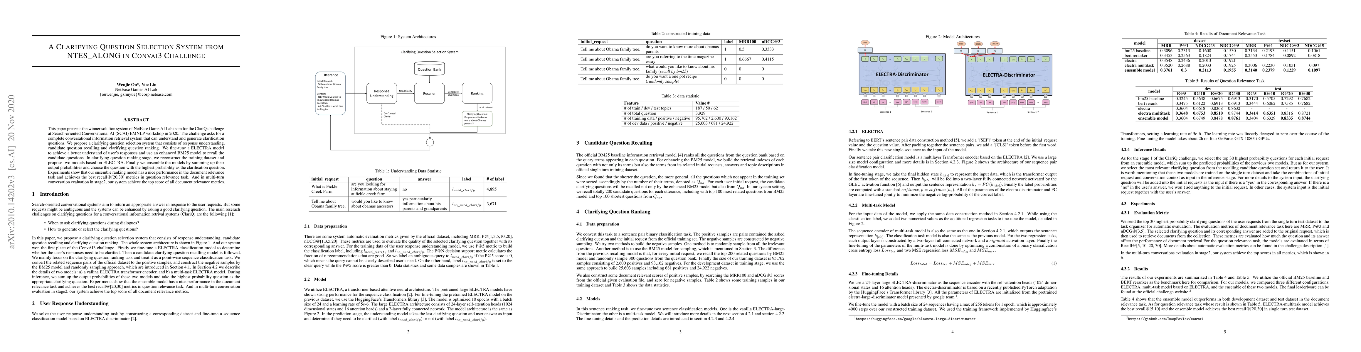 This paper presents the participation of NetEase Game AI Lab team for the ClariQ challenge at Search-oriented Conversational AI (SCAI) EMNLP workshop in 2020. The challenge asks for a complete conversational information retrieval system that can understanding and generating clarification questions. We propose a clarifying question selection system which consists of response understanding, candidate question recalling and clarifying question ranking. We fine-tune a RoBERTa model to understand user's responses and use an enhanced BM25 model to recall the candidate questions. In clarifying question ranking stage, we reconstruct the training dataset and propose two models based on ELECTRA. Finally we ensemble the models by summing up their output probabilities and choose the question with the highest probability as the clarification question. Experiments show that our ensemble ranking model outperforms in the document relevance task and achieves the best recall@[20,30] metrics in question relevance task. And in multi-turn conversation evaluation in stage2, our system achieve the top score of all document relevance metrics.