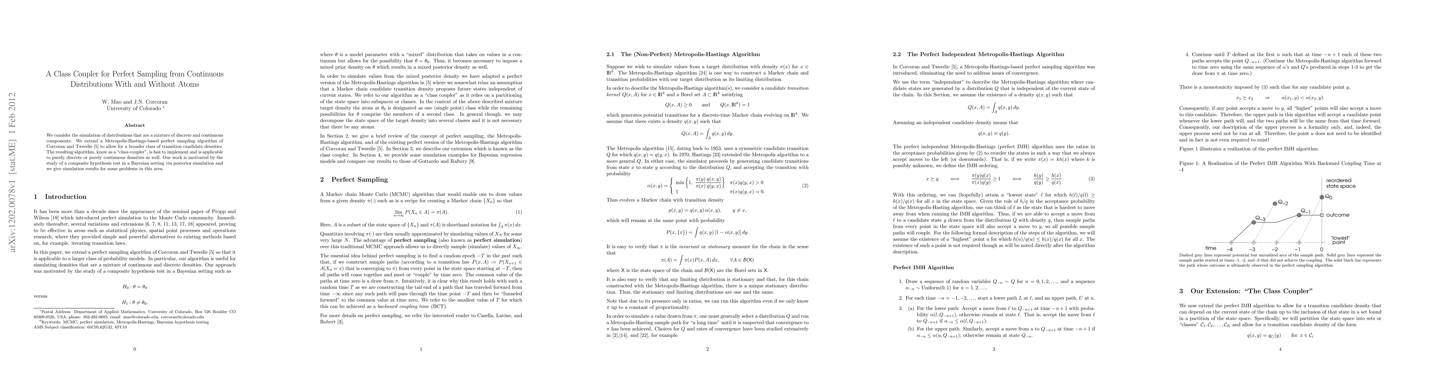 We consider the simulation of distributions that are a mixture of discrete and continuous components. We extend a Metropolis-Hastings-based perfect sampling algorithm of Corcoran and Tweedie to allow for a broader class of transition candidate densities. The resulting algorithm, know as a "class coupler", is fast to implement and is applicable to purely discrete or purely continuous densities as well. Our work is motivated by the study of a composite hypothesis test in a Bayesian setting via posterior simulation and we give simulation results for some problems in this area.