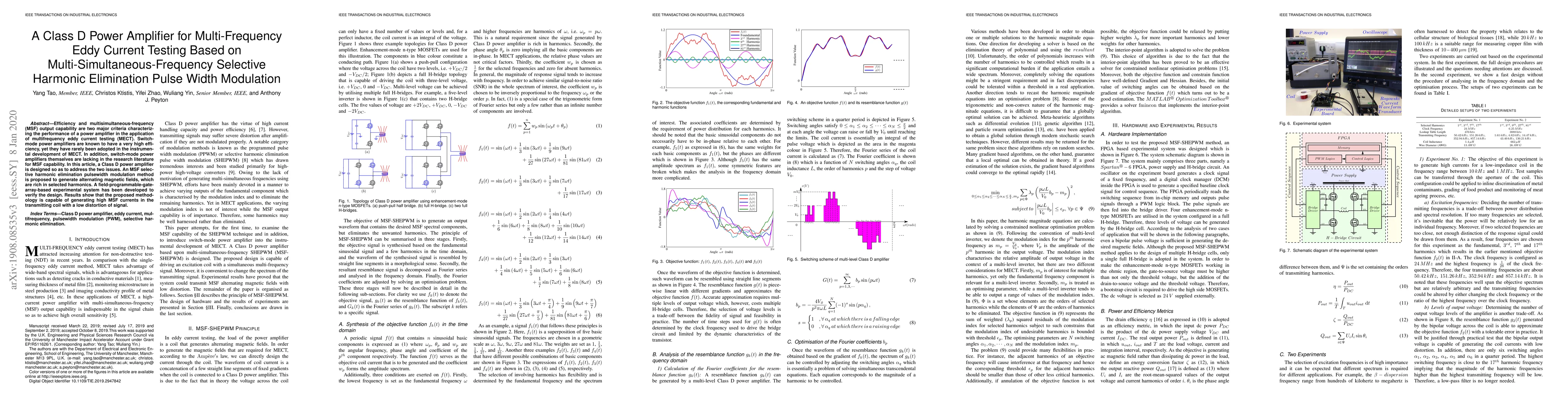 Efficiency and multisimultaneous-frequency (MSF) output capability are two major criteria characterizing the performance of a power amplifier in the application of multifrequency eddy current testing (MECT). Switch-mode power amplifiers are known to have a very high efficiency, yet they have rarely been adopted in the instrumental development of MECT. In addition, switch-mode power amplifiers themselves are lacking in the research literature for MSF capability. In this article, a Class D power amplifier is designed so as to address the two issues. An MSF selective harmonic elimination pulsewidth modulation method is proposed to generate alternating magnetic fields, which are rich in selected harmonics. A field-programmable-gate-array-based experimental system has been developed to verify the design. Results show that the proposed methodology is capable of generating high MSF currents in the transmitting coil with a low distortion of signal.