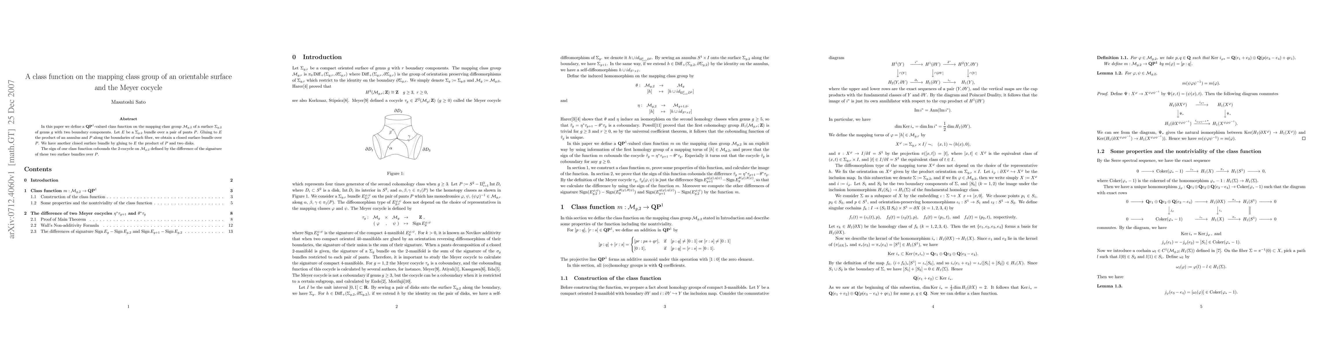 In this paper we define a $\mathbf{QP}^1$-valued class function on the mapping class group $\mathcal{M}_{g,2}$ of a surface $\Sigma_{g,2}$ of genus $g$ with two boundary components. Let $E$ be a $\Sigma_{g,2}$ bundle over a pair of pants $P$. Gluing to $E$ the product of an annulus and $P$ along the boundaries of each fiber, we obtain a closed surface bundle over $P$. We have another closed surface bundle by gluing to $E$ the product of $P$ and two disks. The sign of our class function cobounds the 2-cocycle on $\mathcal{M}_{g,2}$ defined by the difference of the signature of these two surface bundles over $P$.