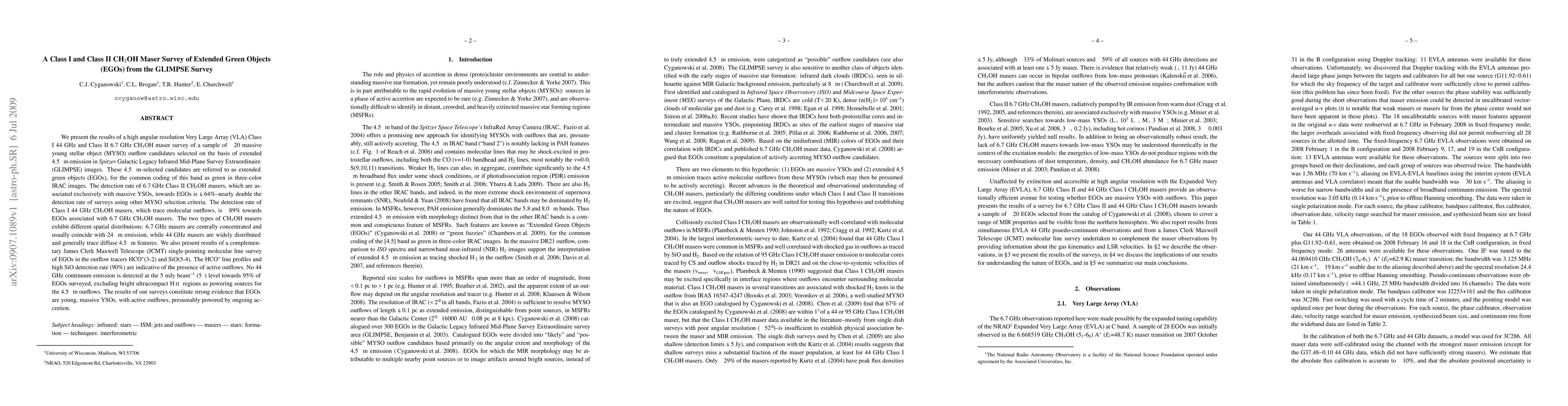 This paper reports a survey of methanol masers in extended green objects (EGOs) identified via Spitzer's GLIMPSE survey, finding high detection rates of Class II masers associated with massive young stellar objects and Class I masers tracing molecular outflows. The study also indicates that EGOs are likely young, massive YSOs with active outflows.