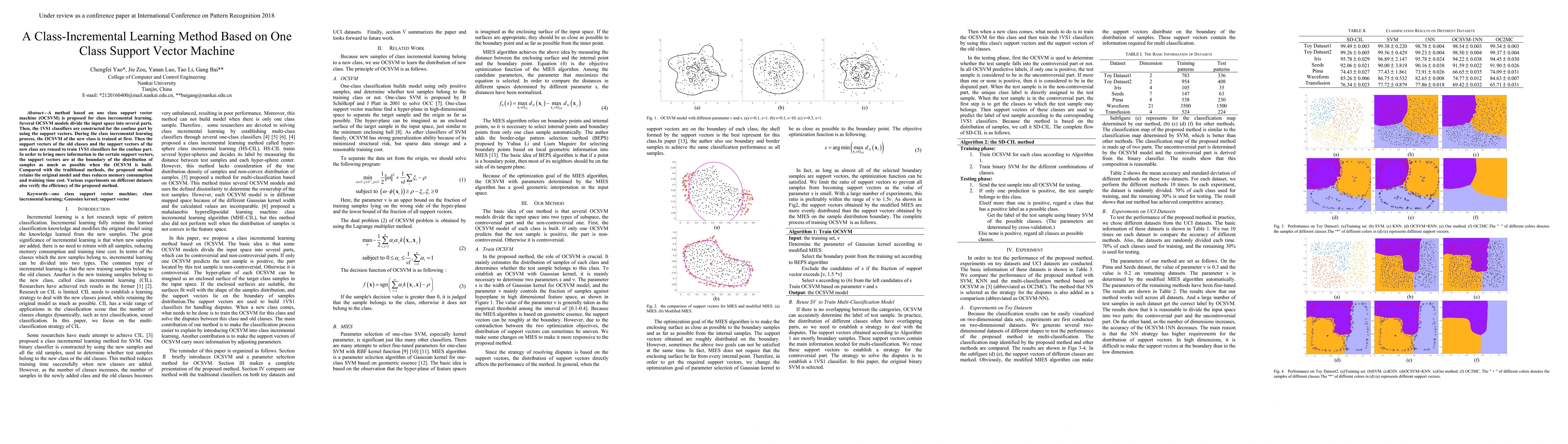 This paper proposes a class-incremental learning method using one class support vector machines (OCSVM) that divides the input space into parts and constructs 1VS1 classifiers for confusing regions. The method reuses support vectors to train classifiers, optimizing boundary support vectors for efficiency, and demonstrates reduced memory and training time compared to traditional methods through experiments on various datasets.