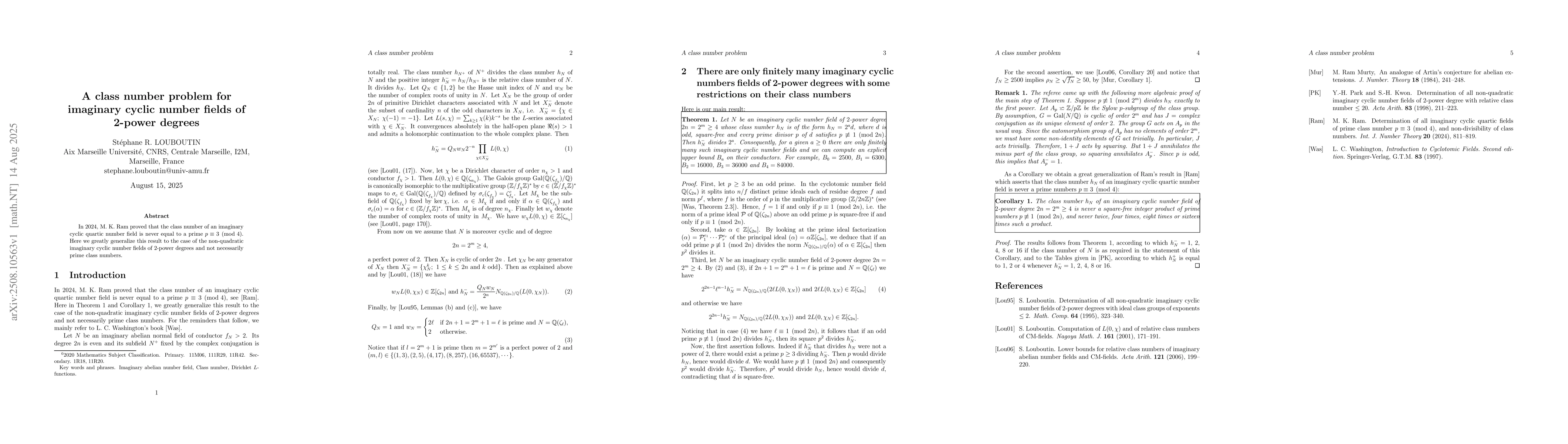 In 2024, M. K. Ram proved that the class number of an imaginary cyclic quartic number field is never equal to a prime $p\equiv 3\pmod 4$. Here we greatly generalize this result to the case of the non-quadratic imaginary cyclic number fields of $2$-power degrees and not necessarily prime class numbers.