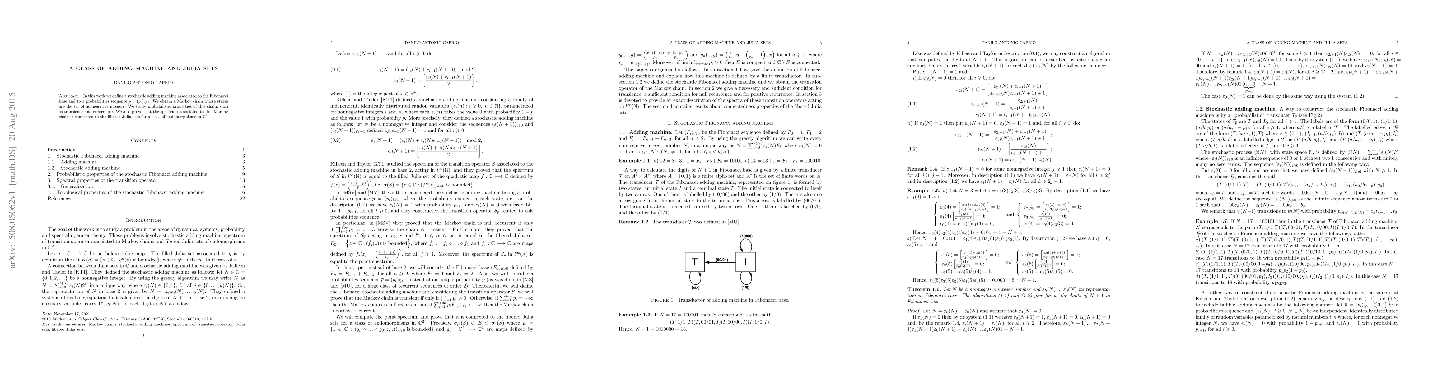 In this work we define a stochastic adding machine associated to the Fibonacci base and to a probabilities sequence $\overline{p}=(p_i)_{i\geq 1}$. We obtain a Markov chain whose states are the set of nonnegative integers. We study probabilistic properties of this chain, such as transience and recurrence. We also prove that the spectrum associated to this Markov chain is connected to the fibered Julia sets for a class of endomorphisms in $\mathbb{C}^2$.