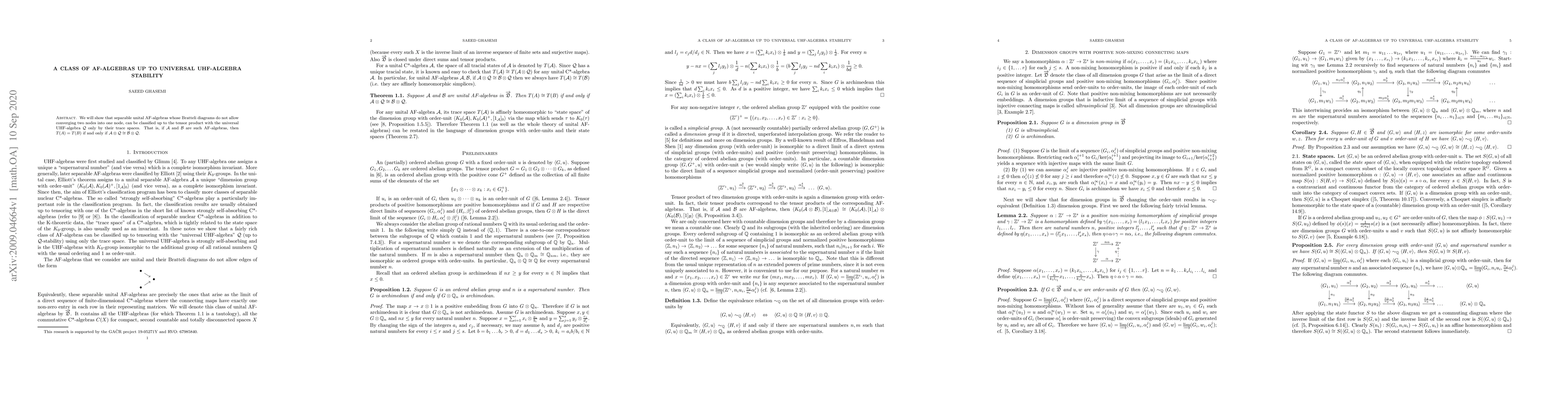 Summary: This paper classifies separable unital AF-algebras with specific Bratteli diagram properties up to stability with the universal UHF-algebra $\Q$ solely based on their trace spaces, establishing an equivalence between trace space equality and tensor product isomorphism with $\Q$.