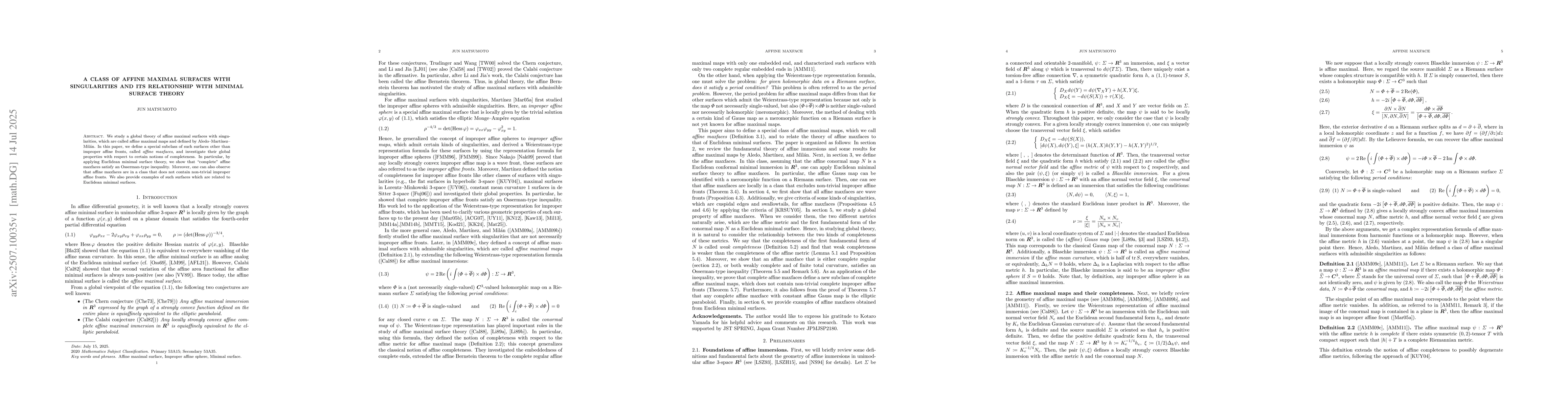 We study a global theory of affine maximal surfaces with singularities, which are called affine maximal maps and defined by Aledo--Mart\' inez--Mil\' an. In this paper, we define a special subclass of such surfaces other than improper affine fronts, called \emph{affine maxfaces}, and investigate their global properties with respect to certain notions of completeness. In particular, by applying Euclidean minimal surface theory, we show that ``complete'' affine maxfaces satisfy an Osserman-type inequality. Moreover, one can also observe that affine maxfaces are in a class that does not contain non-trivial improper affine fronts. We also provide examples of such surfaces which are related to Euclidean minimal surfaces.