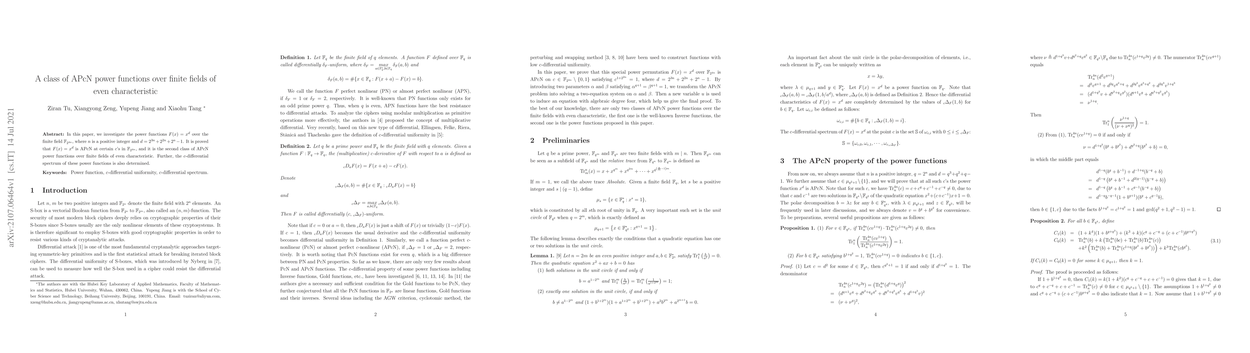 A class of APcN power functions over finite fields of even characteristic has been discovered, with certain values of c being proven to satisfy the APcN condition.