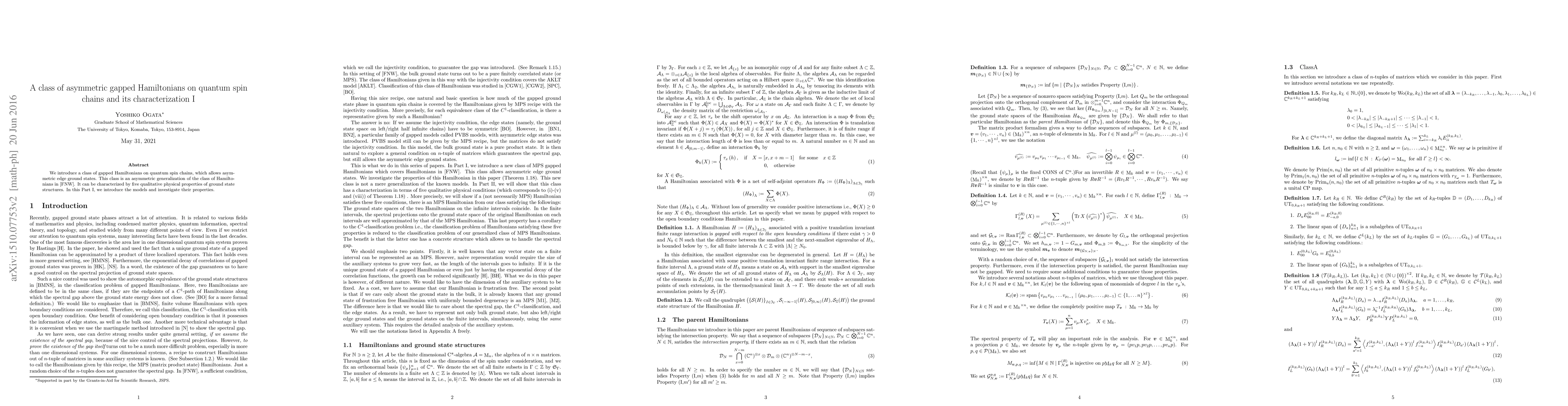 We introduce a class of gapped Hamiltonians on quantum spin chains, which allows asymmetric edge ground states. This class is an asymmetric generalization of the class of Hamiltonians in [FNS]. It can be characterized by five qualitative physical properties of ground state structures. In this Part I, we introduce the models and investigate their properties.