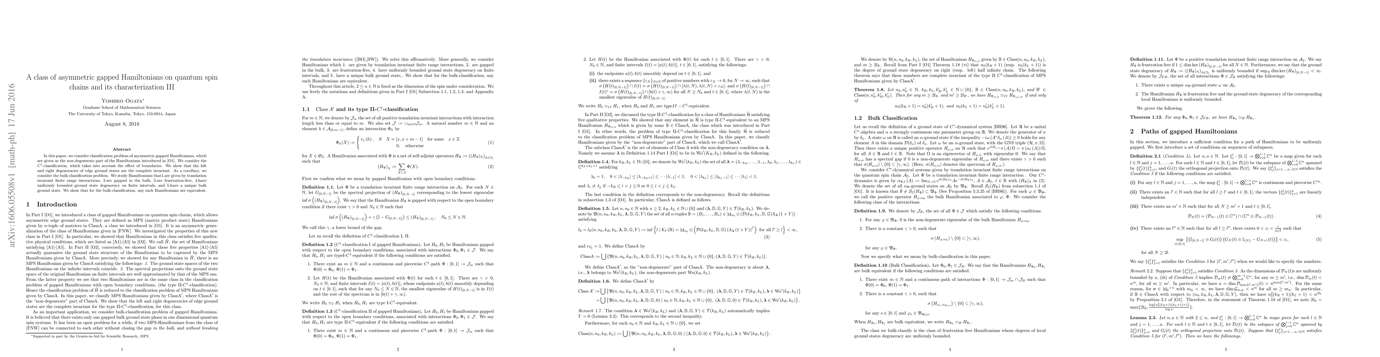 This paper classifies asymmetric gapped Hamiltonians on quantum spin chains, focusing on edge degeneracies as complete invariants. It proves bulk-classification equivalence for translation-invariant, frustration-free Hamiltonians with uniformly bounded ground state degeneracy and a unique bulk ground state.