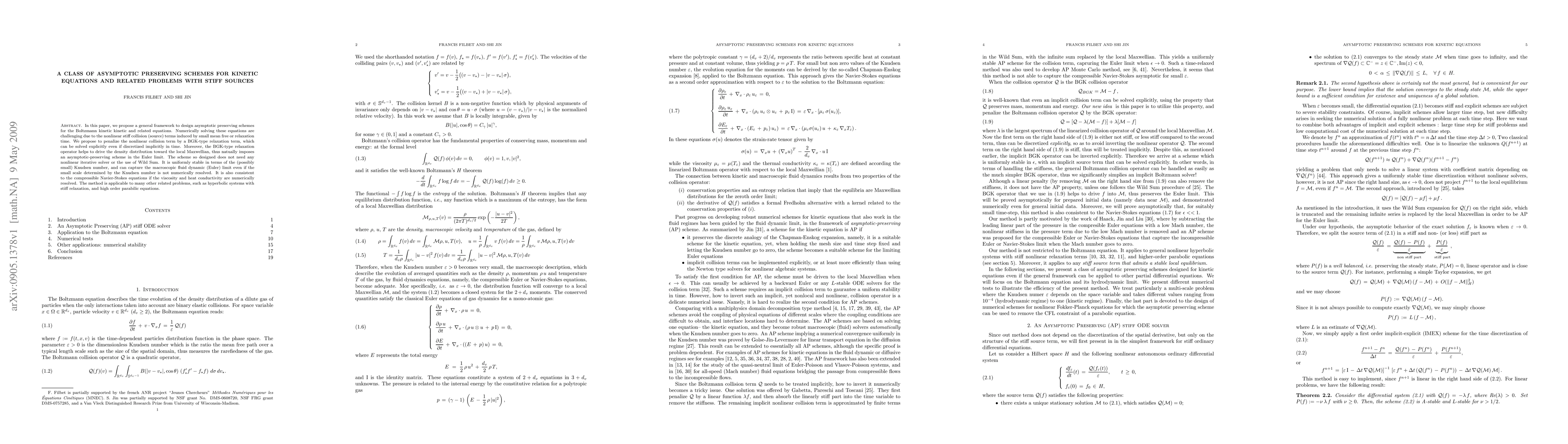 This paper proposes a framework for designing asymptotic preserving schemes to solve Boltzmann kinetic and related equations, addressing the challenges posed by nonlinear stiff collision terms. The method uses a BGK-type relaxation term to stabilize the numerical solution, ensuring uniform stability and capturing the Euler limit without requiring iterative solvers.