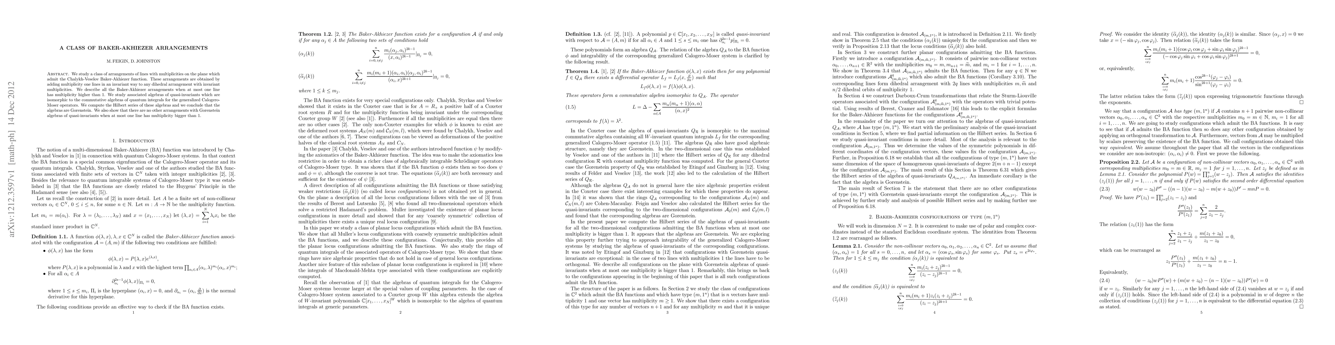 We study a class of arrangements of lines with multiplicities on the plane which admit the Chalykh-Veselov Baker-Akhiezer function. These arrangements are obtained by adding multiplicity one lines in an invariant way to any dihedral arrangement with invariant multiplicities. We describe all the Baker-Akhiezer arrangements when at most one line has multiplicity higher than 1. We study associated algebras of quasi-invariants which are isomorphic to the commutative algebras of quantum integrals for the generalized Calogero-Moser operators. We compute the Hilbert series of these algebras and we conclude that the algebras are Gorenstein. We also show that there are no other arrangements with Gorenstein algebras of quasi-invariants when at most one line has multiplicity bigger than 1.