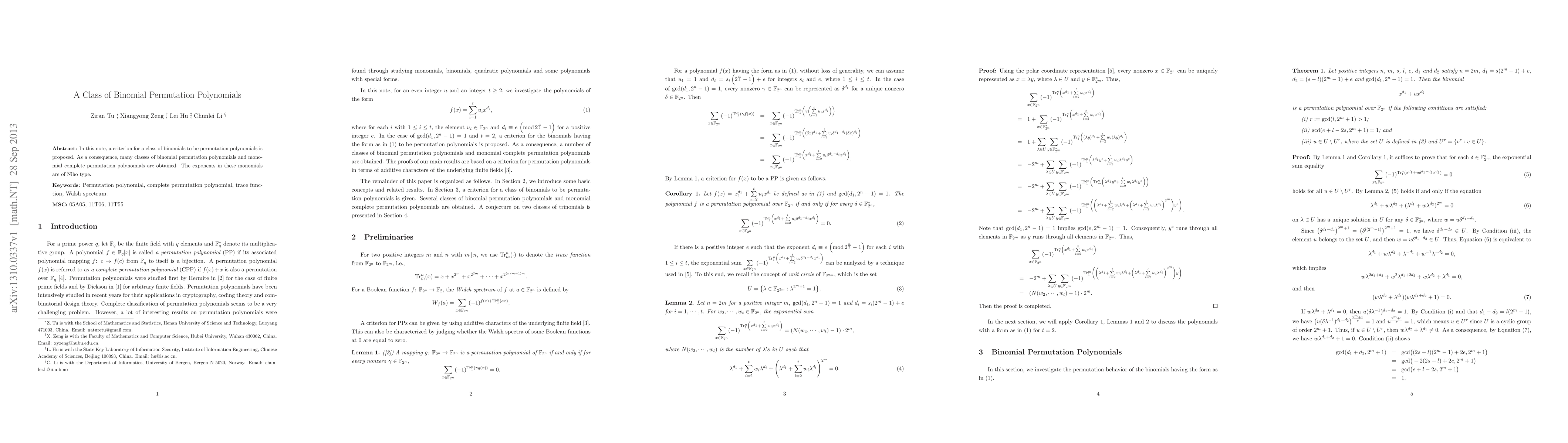 Researchers propose a criterion for identifying binomial permutation polynomials, leading to discoveries of new classes of monomial complete permutation polynomials with Niho-type exponents.