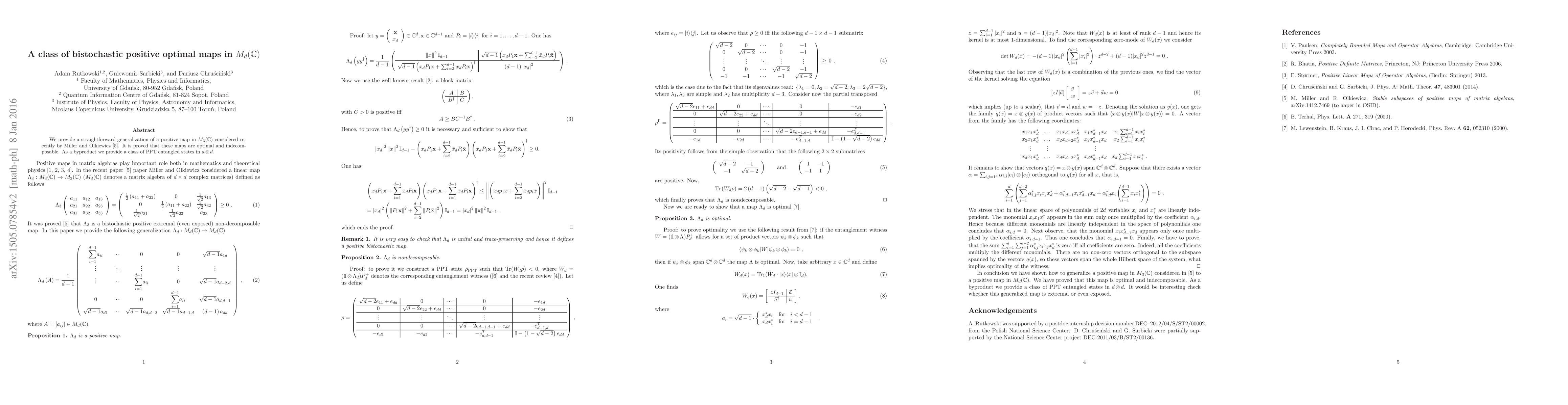 Researchers discovered a class of optimal and indecomposable positive maps in $M_d(/mathbb{C})$, which also produce entangled states in $d imes d$ systems.