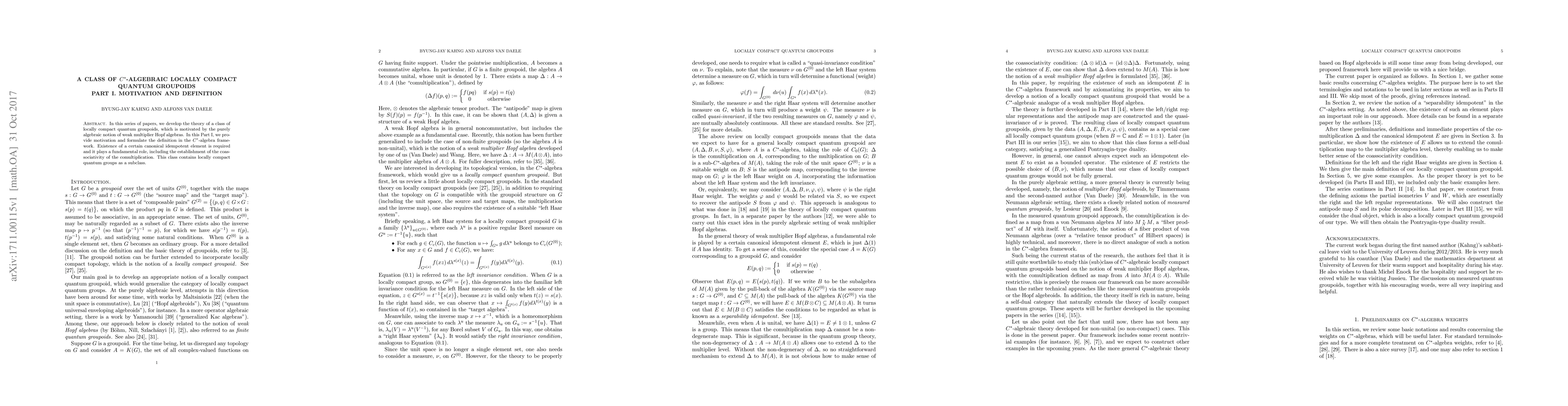 In this series of papers, we develop the theory of a class of locally compact quantum groupoids, which is motivated by the purely algebraic notion of weak multiplier Hopf algebras. In this Part I, we provide motivation and formulate the definition in the C*-algebra framework. Existence of a certain canonical idempotent element is required and it plays a fundamental role, including the establishment of the coassociativity of the comultiplication. This class contains locally compact quantum groups as a subclass.